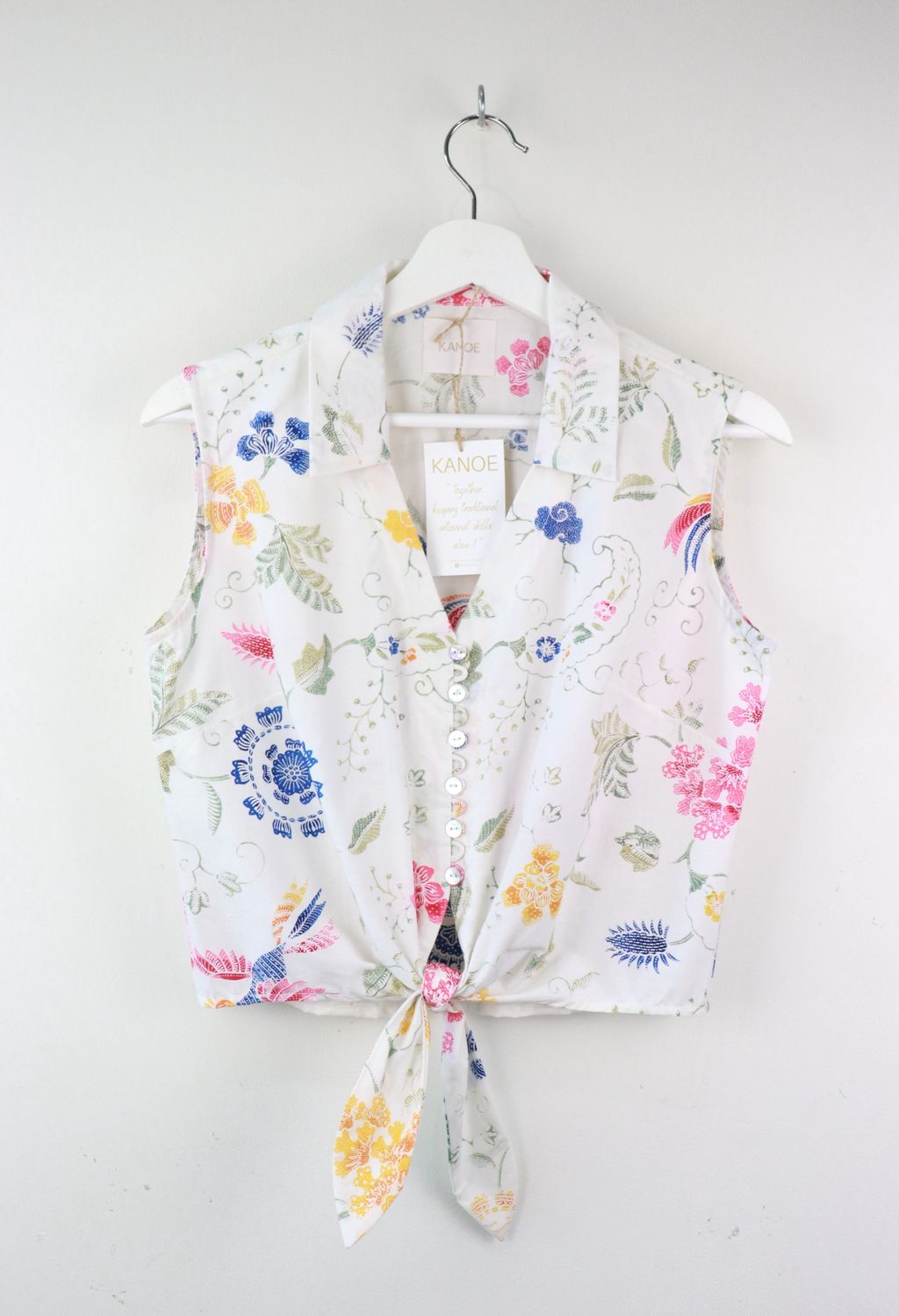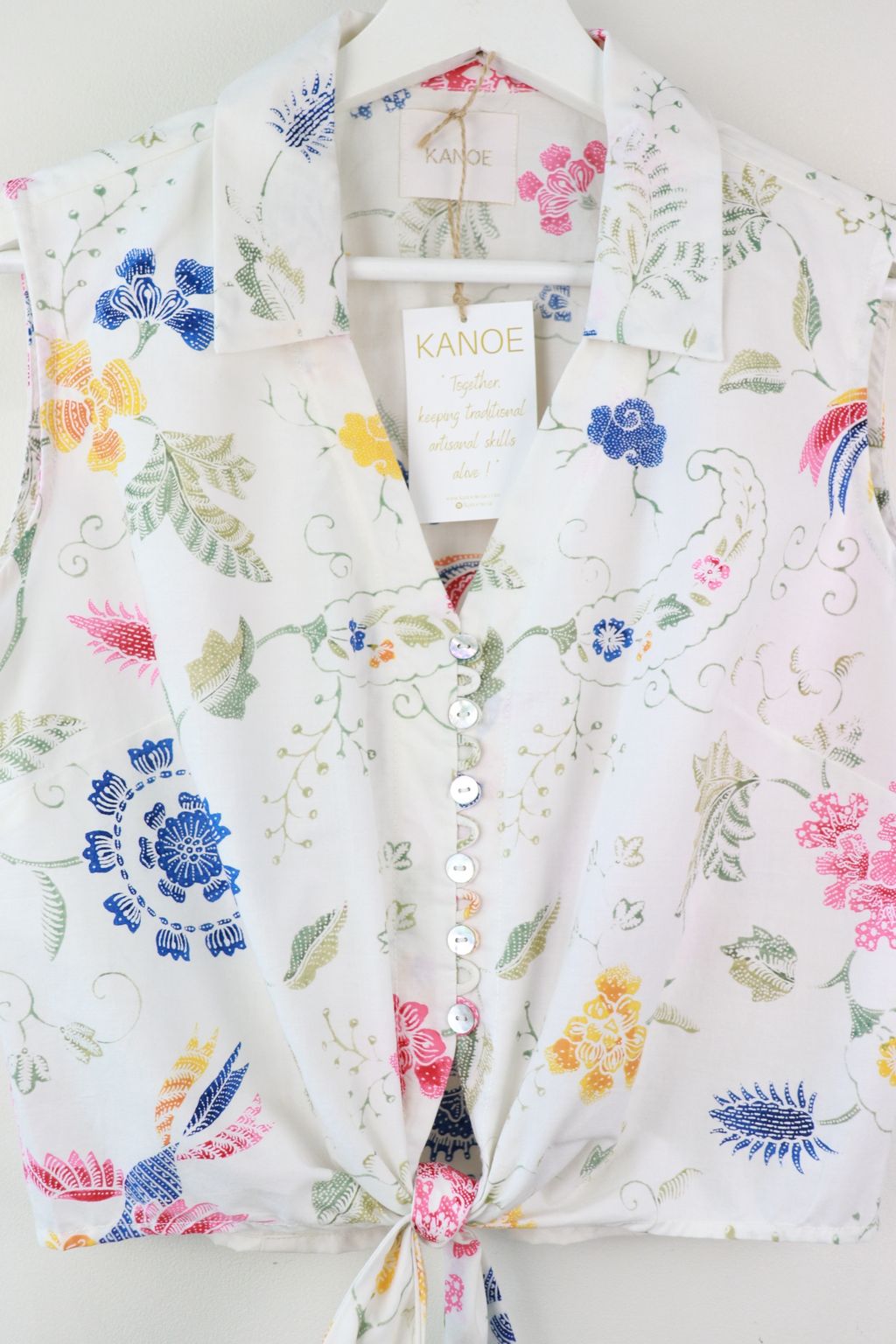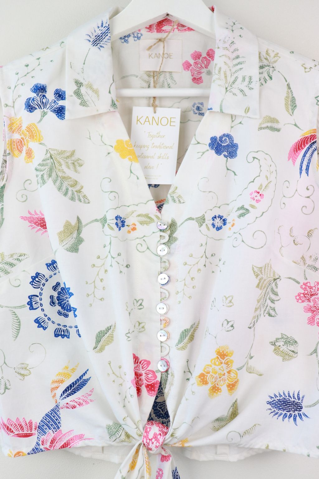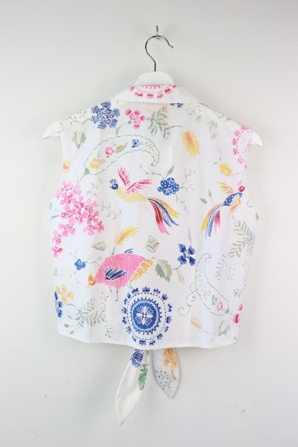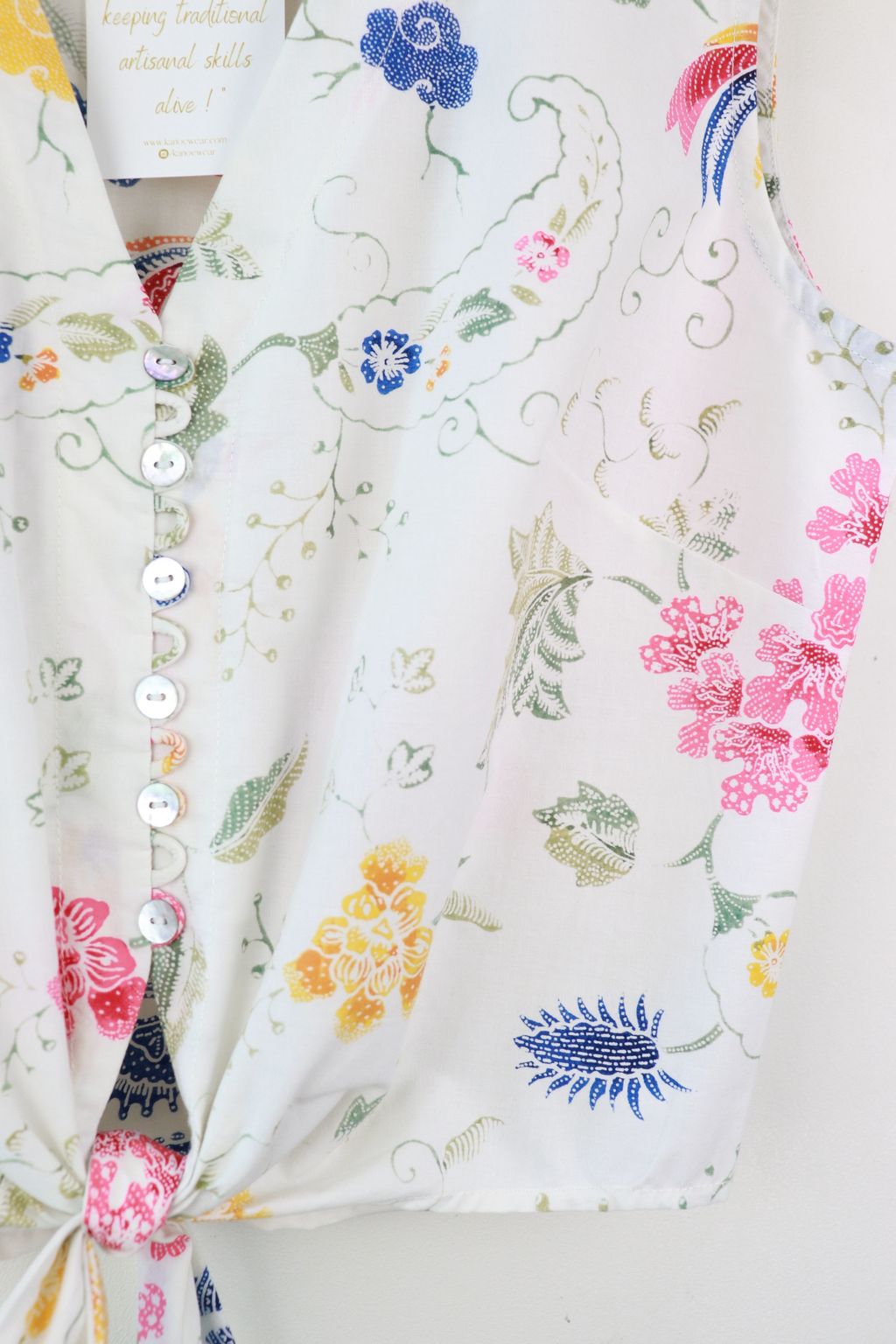 These pastel sleeveless front tie top are made from intricate hand stamped batik textile. Not one piece alike, you will love how beautiful the colours and print of this batik is made by skilled artisans of centuries of batik making wisdom. These batik come from a region where the batik makers have influence from Chinese and European merchants in which is on display in the motifs and colours of the batik.