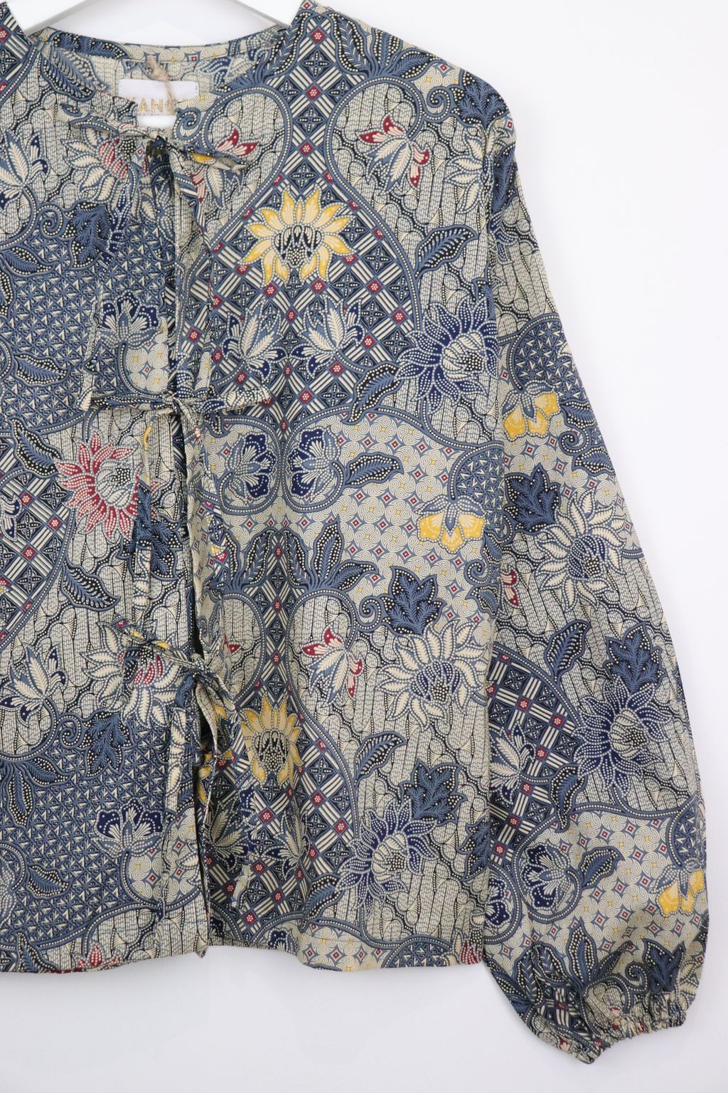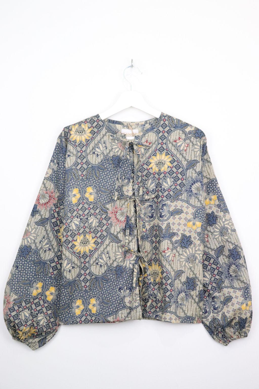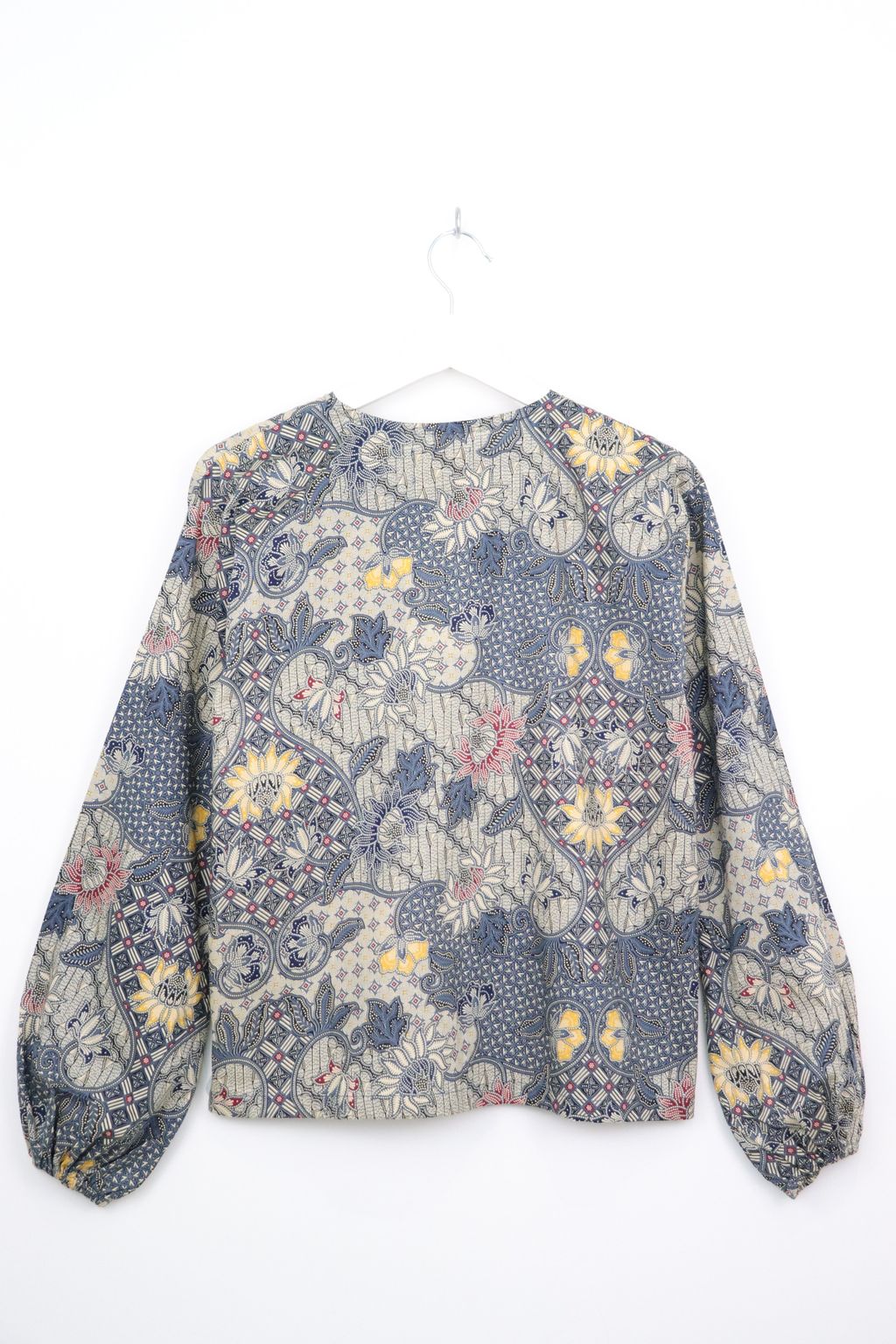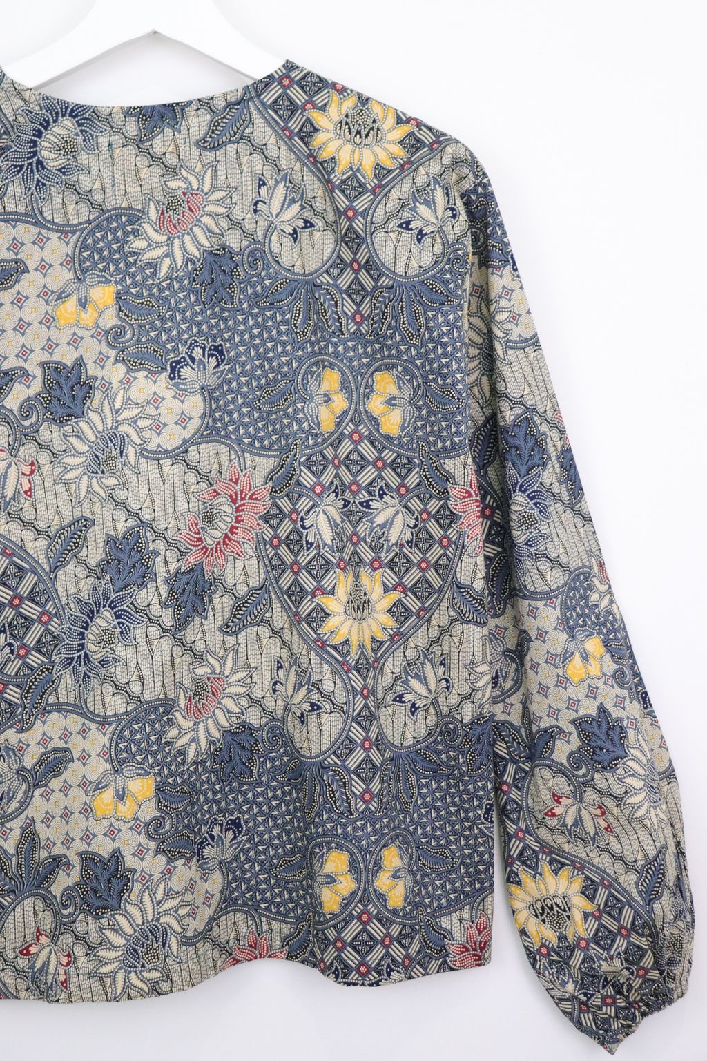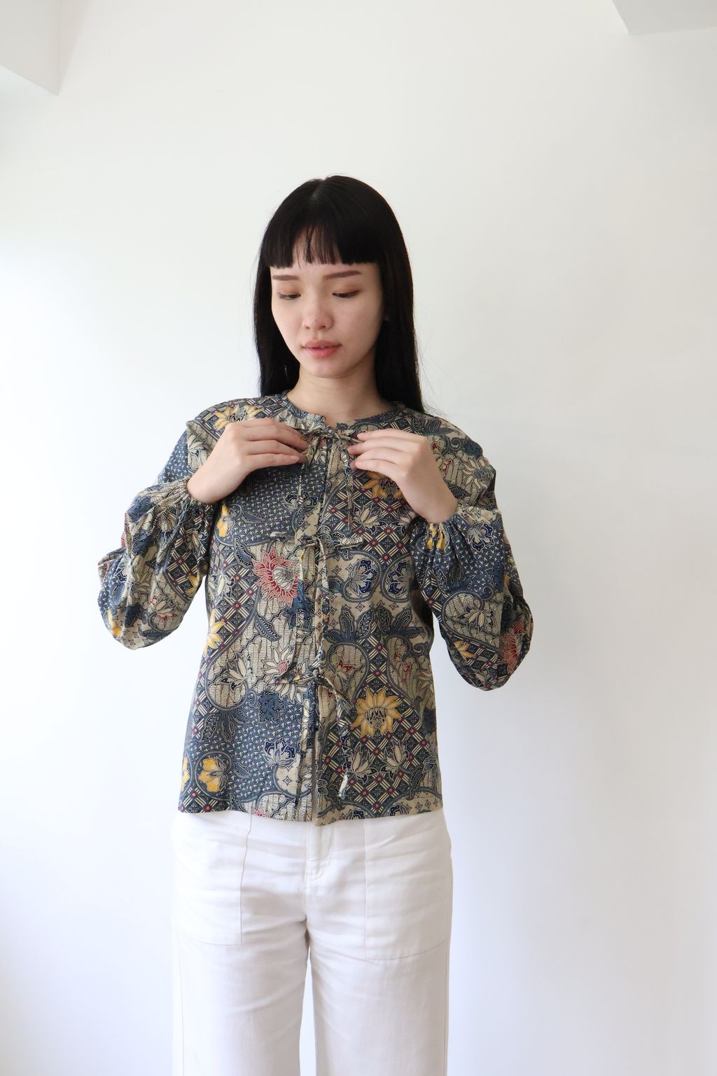 A graceful yet practical batik piece designed with modest wear in mind. The front ties into a sweet bow, giving the top a feminine touch while the hidden snap button keeps everything secure and comfortable.