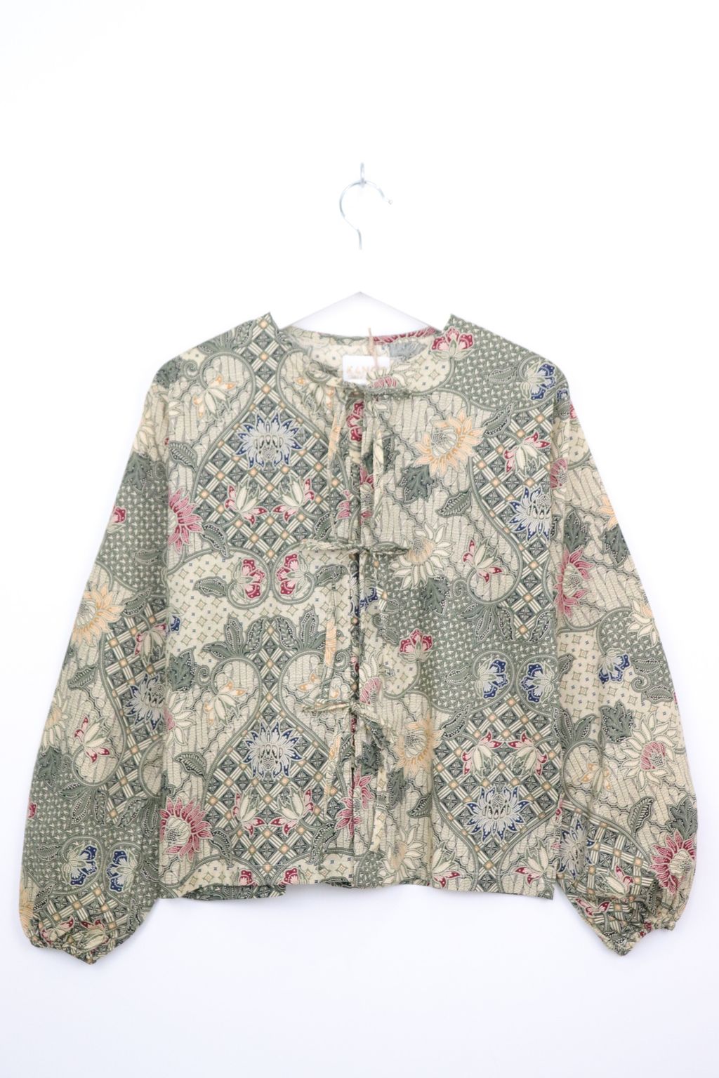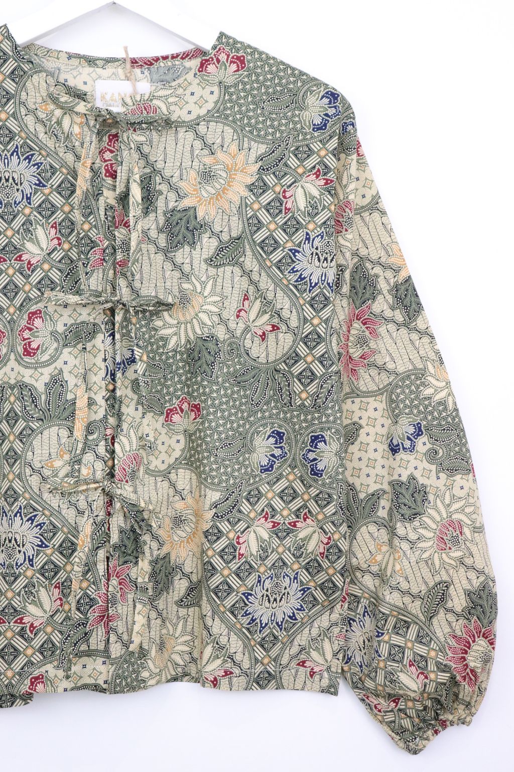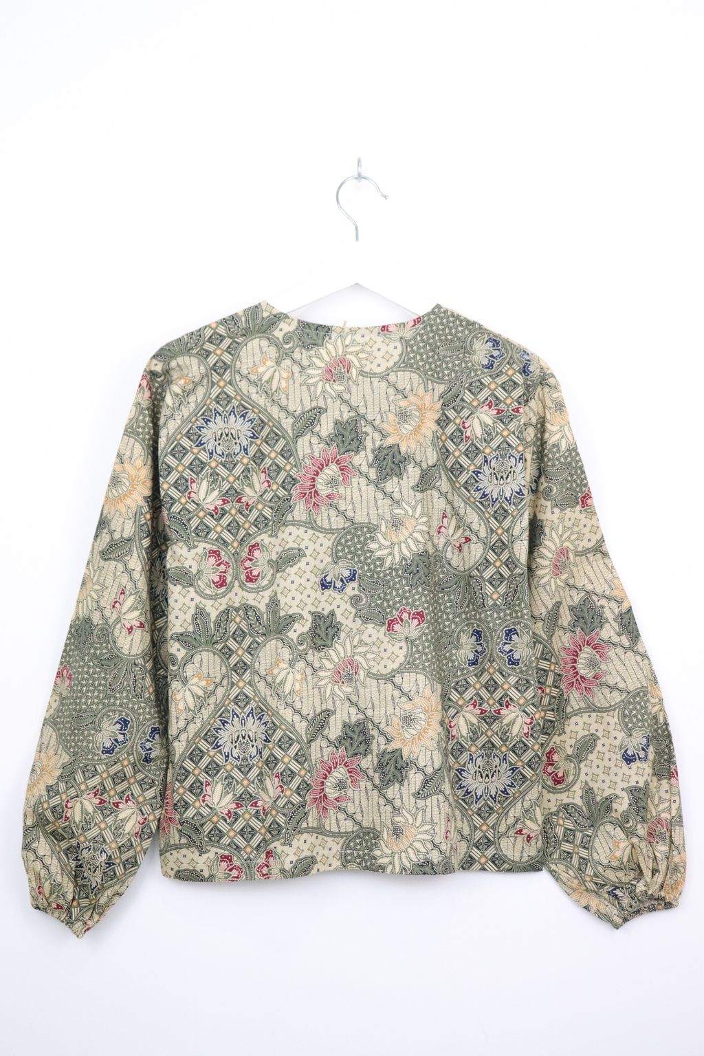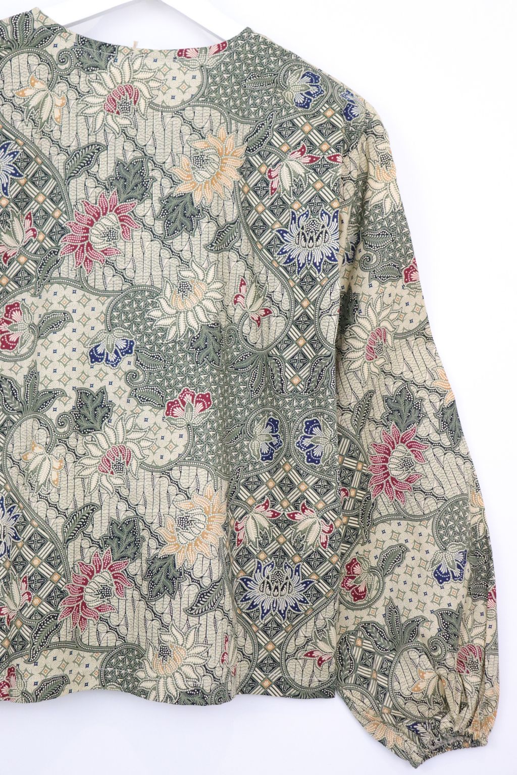 A graceful yet practical batik piece designed with modest wear in mind. The front ties into a sweet bow, giving the top a feminine touch while the hidden snap button keeps everything secure and comfortable.