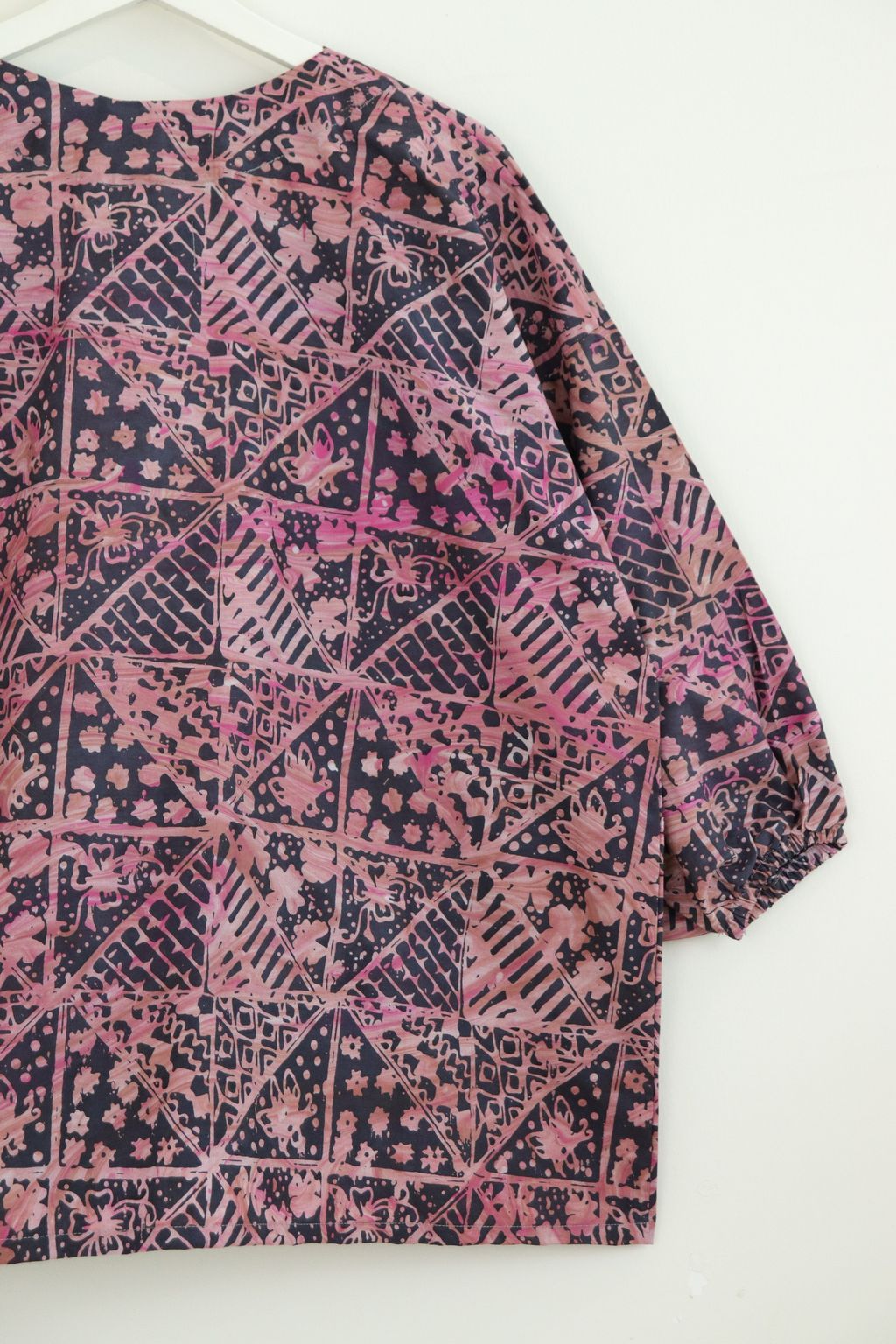 They have pockets in the front, as well a curved sleeve with elastic at the end of the sleeve which gives from for comfort of ease of movement as well a handy place for you to keep items when your hands are full! These pieces are also made with handstamped batik done locally by Malaysian Artisans!