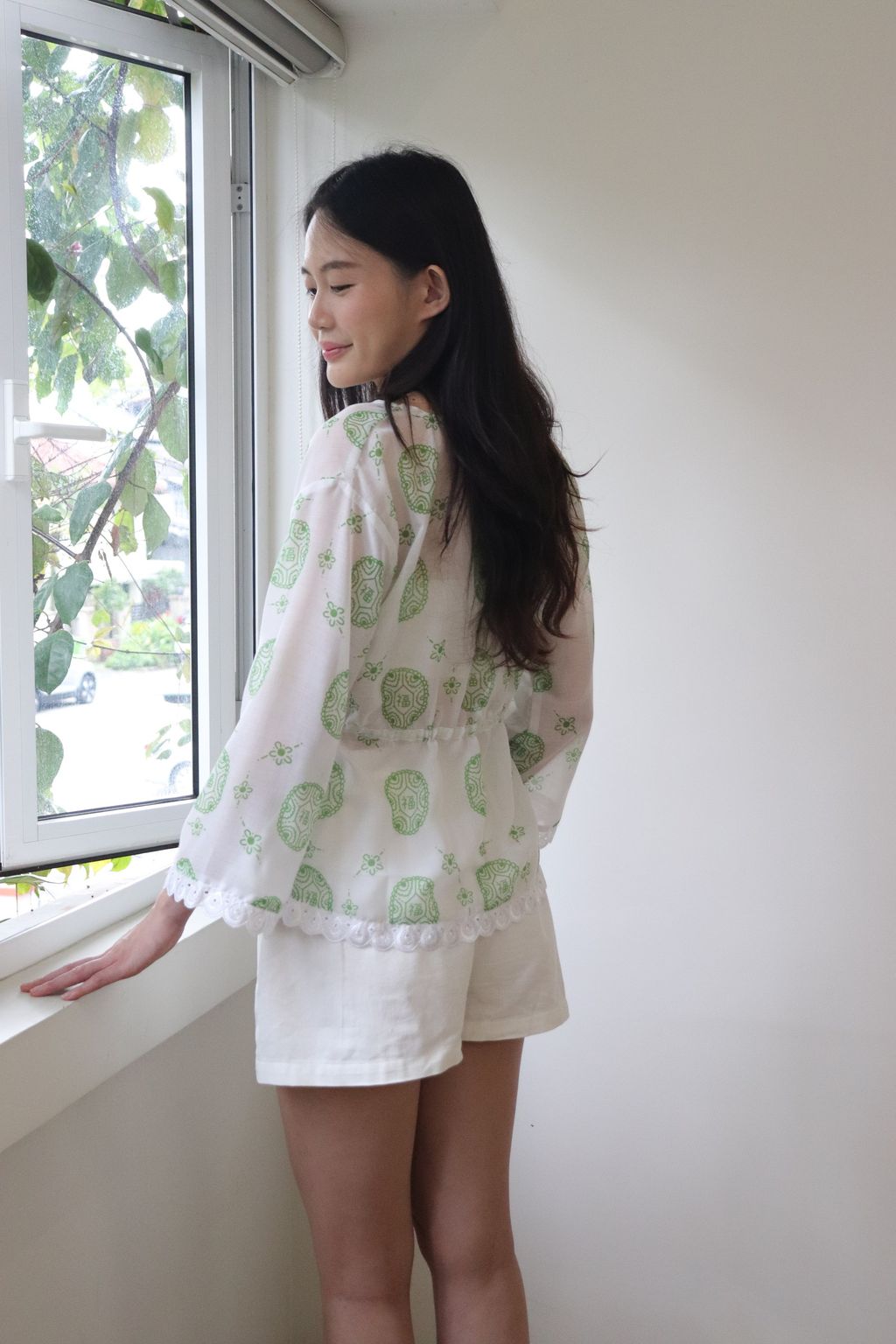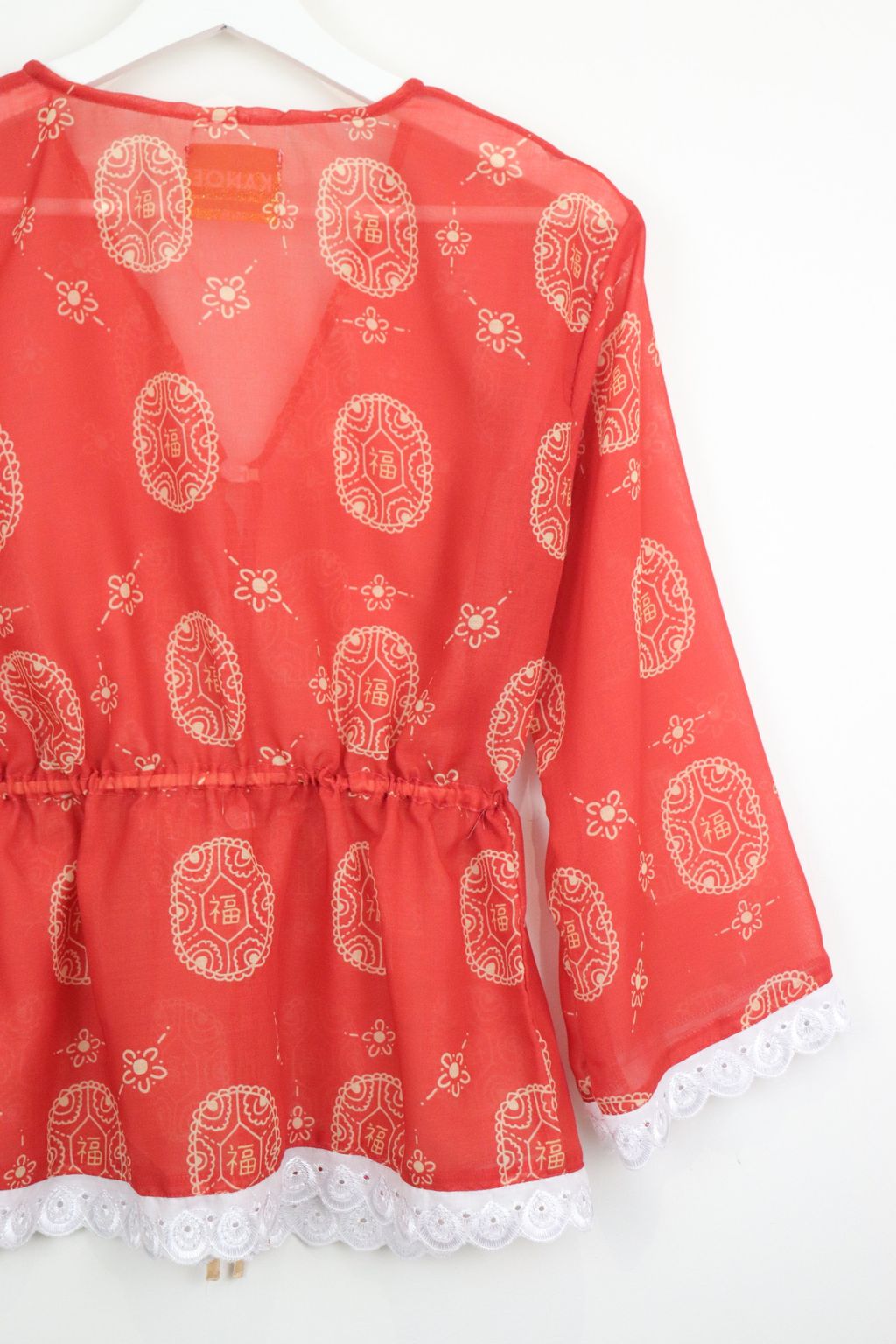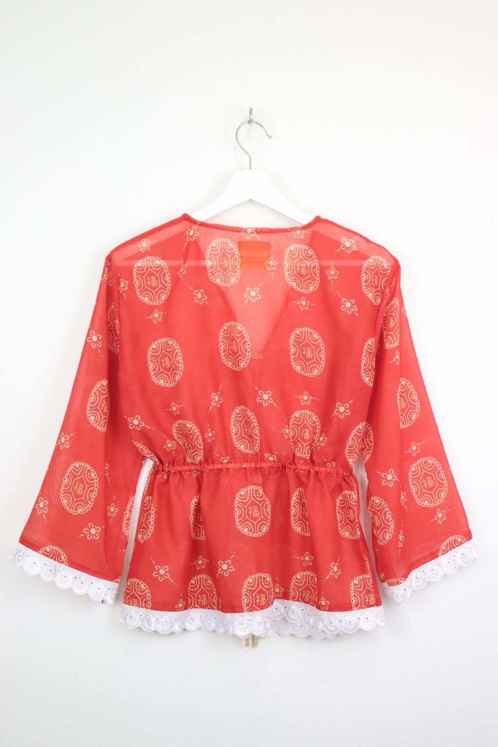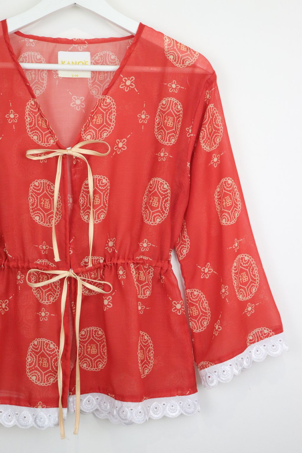 Featuring the same playful Ang Ku Kuih 福 (fú) print and colour story, this thrower celebrates joy, good fortune, and positivity in a subtle, modern way. The adjustable waist tie allows you to pull it in for a gentle shape or wear it loose for a relaxed silhouette. Slightly sheer in texture, it’s perfect for layering over your favourite top or inner.