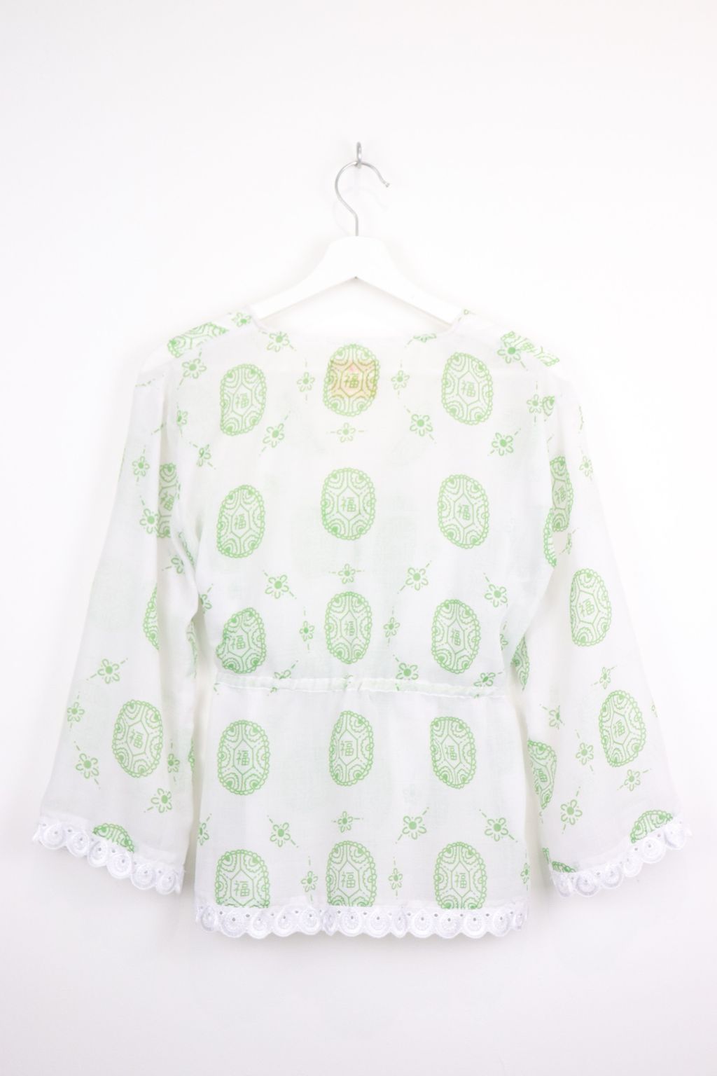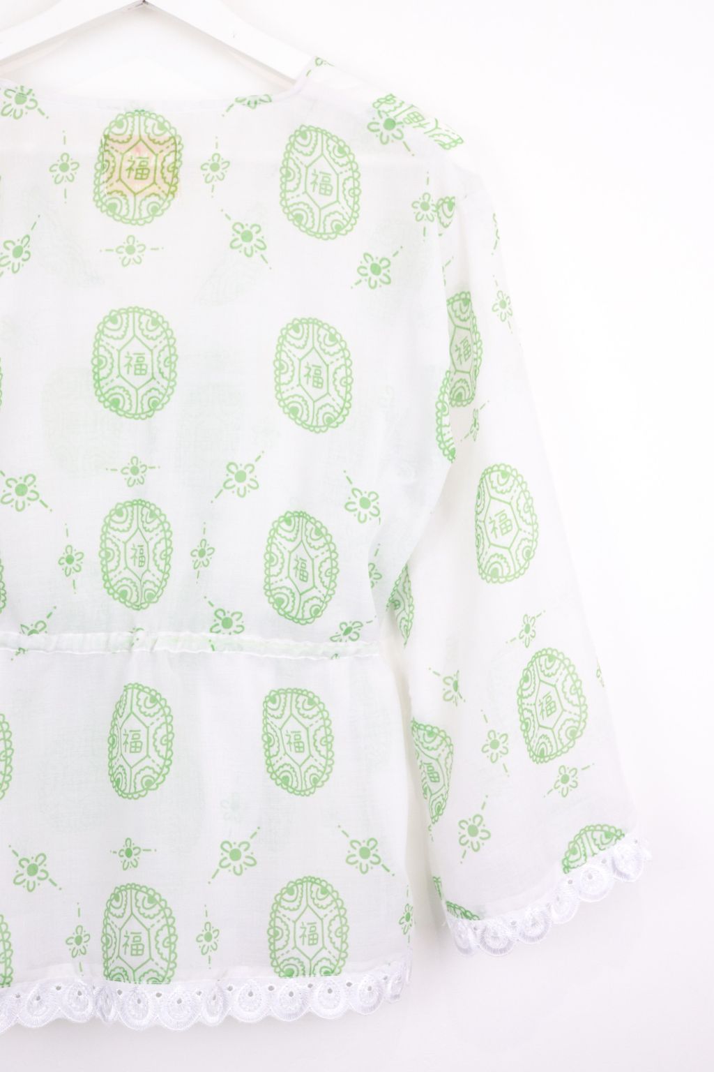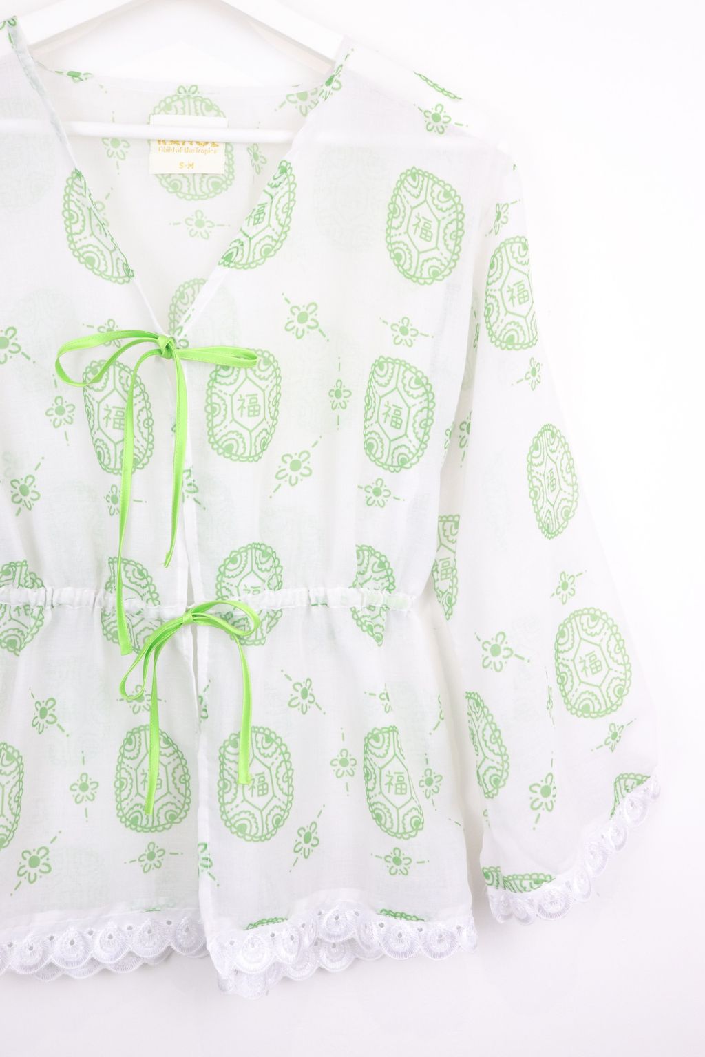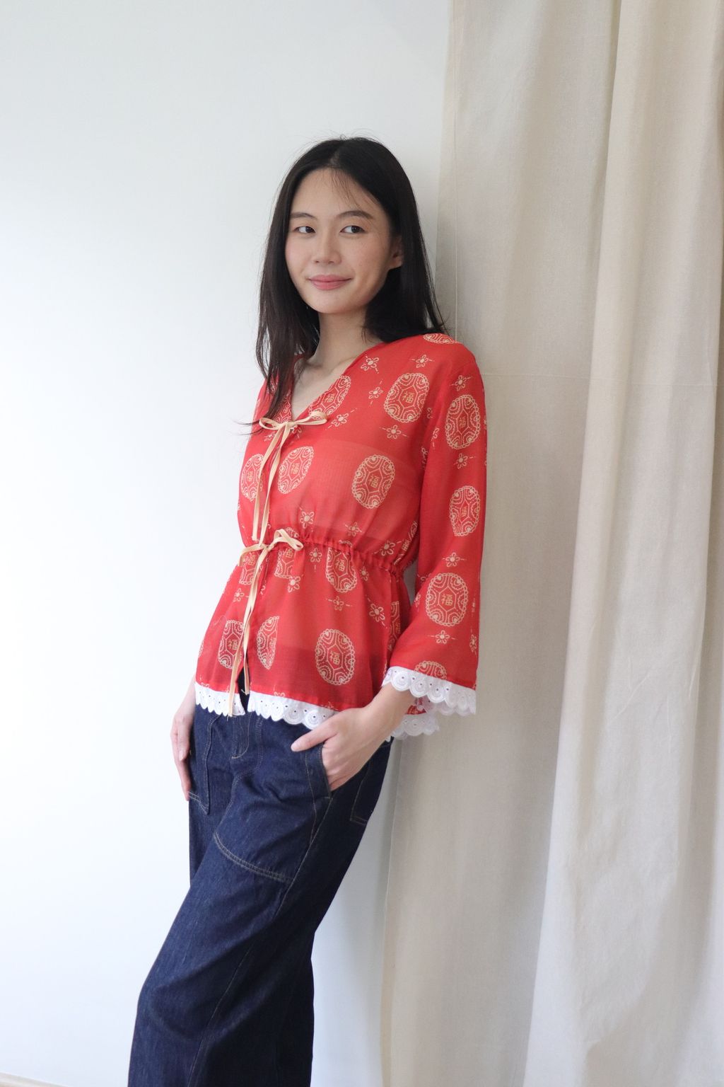 Featuring the same playful Ang Ku Kuih 福 (fú) print and colour story, this thrower celebrates joy, good fortune, and positivity in a subtle, modern way. The adjustable waist tie allows you to pull it in for a gentle shape or wear it loose for a relaxed silhouette. Slightly sheer in texture, it’s perfect for layering over your favourite top or inner.