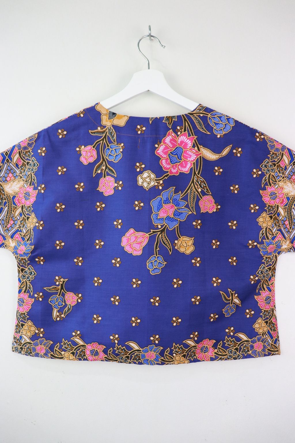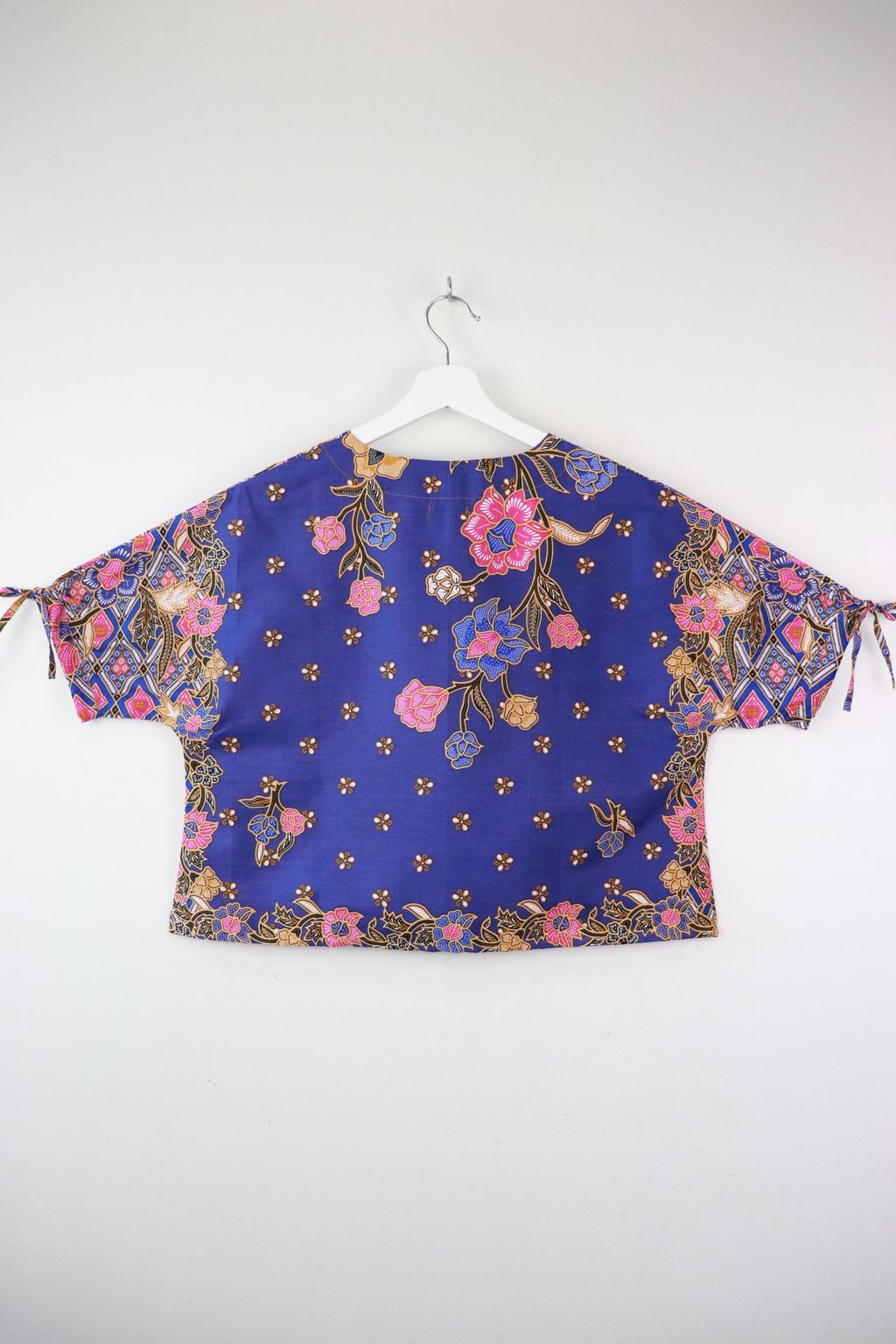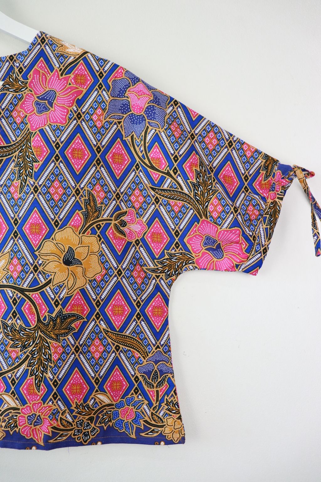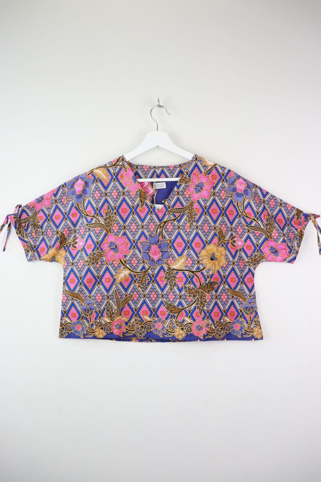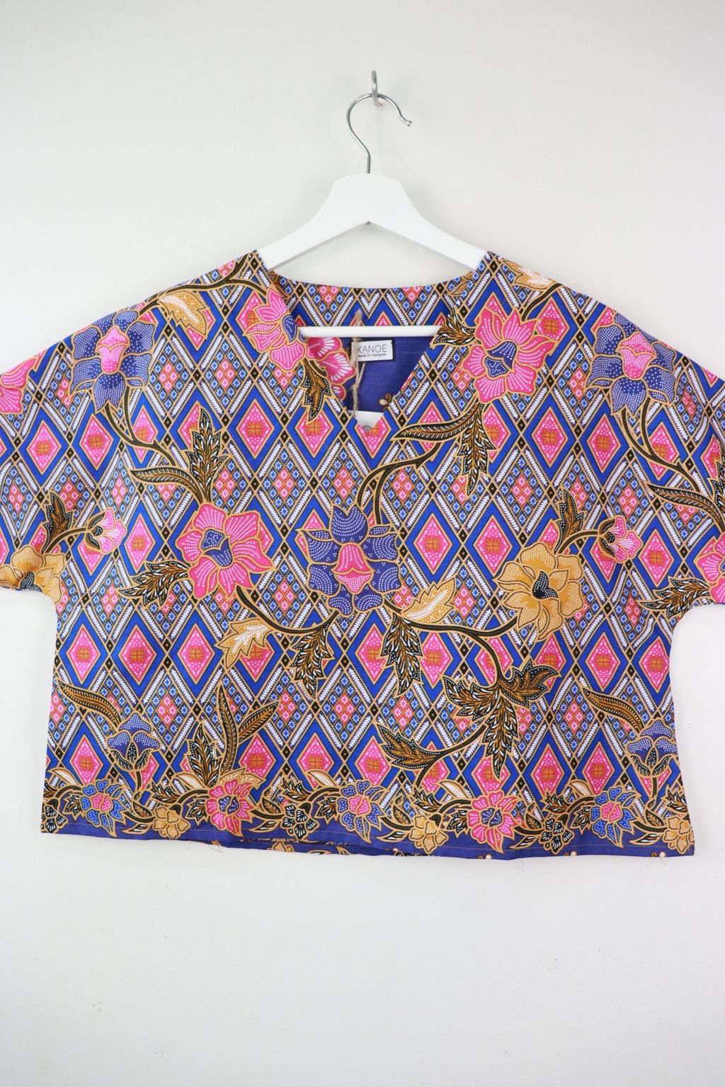 The simple V - neck batik top that suits most figures very well. With sleeves that fall on the shoulders. Wear this with a plain bottom. Both work and play friendly !
