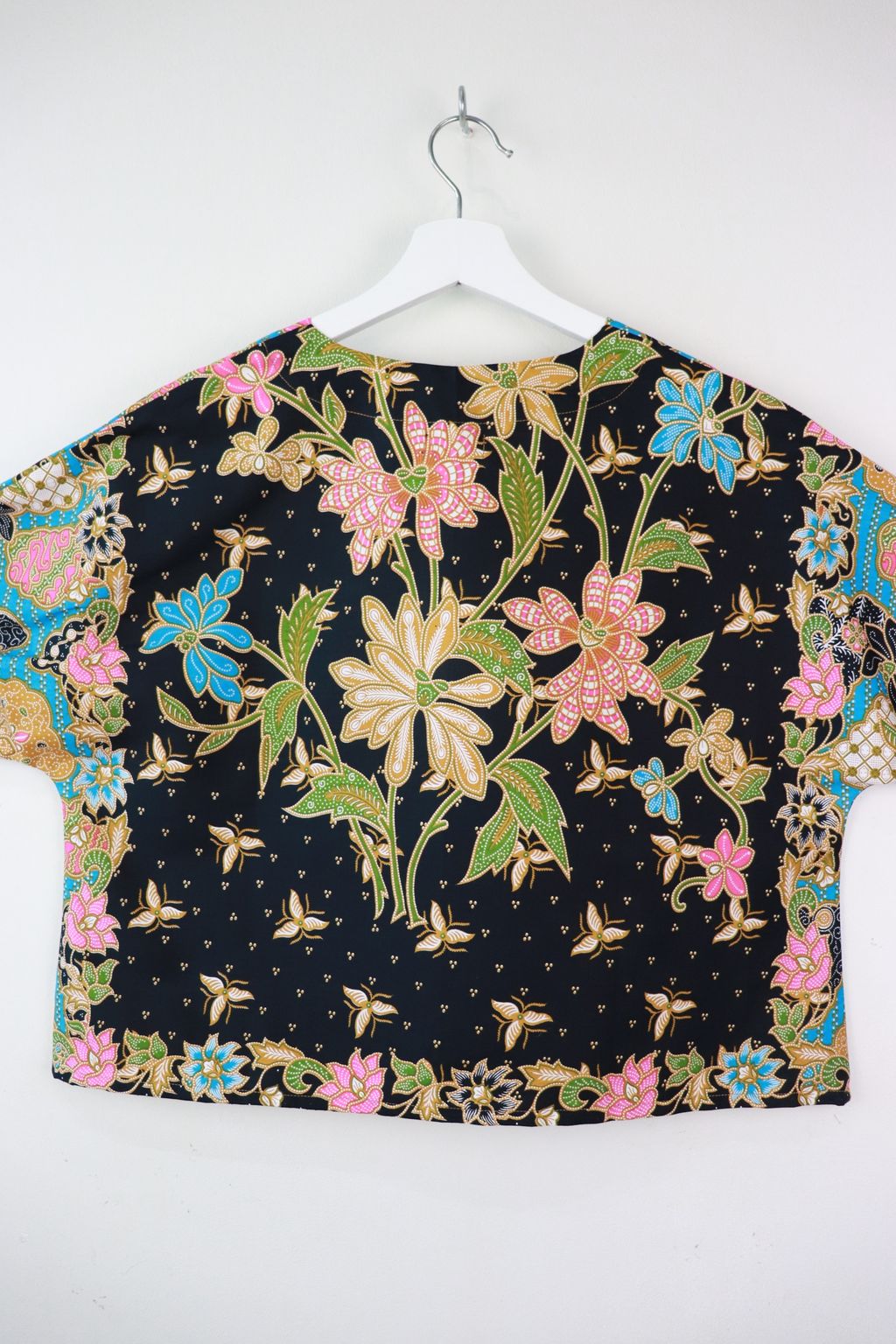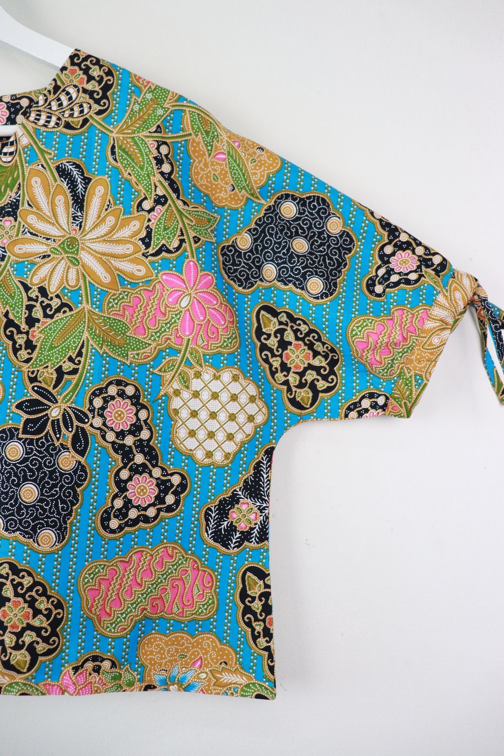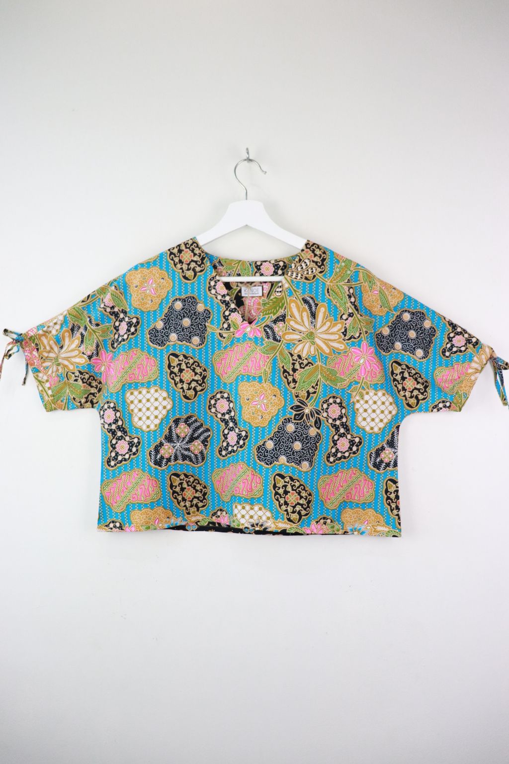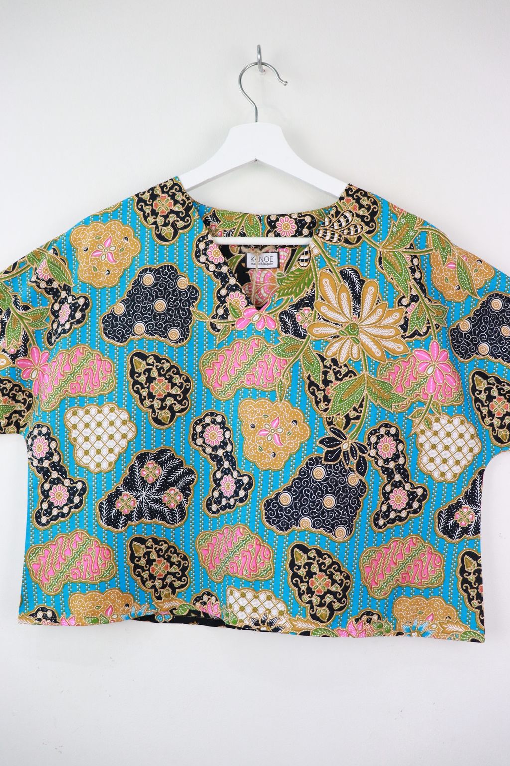 The simple V - neck batik top that suits most figures very well. With sleeves that fall on the shoulders. Wear this with a plain bottom. Both work and play friendly !