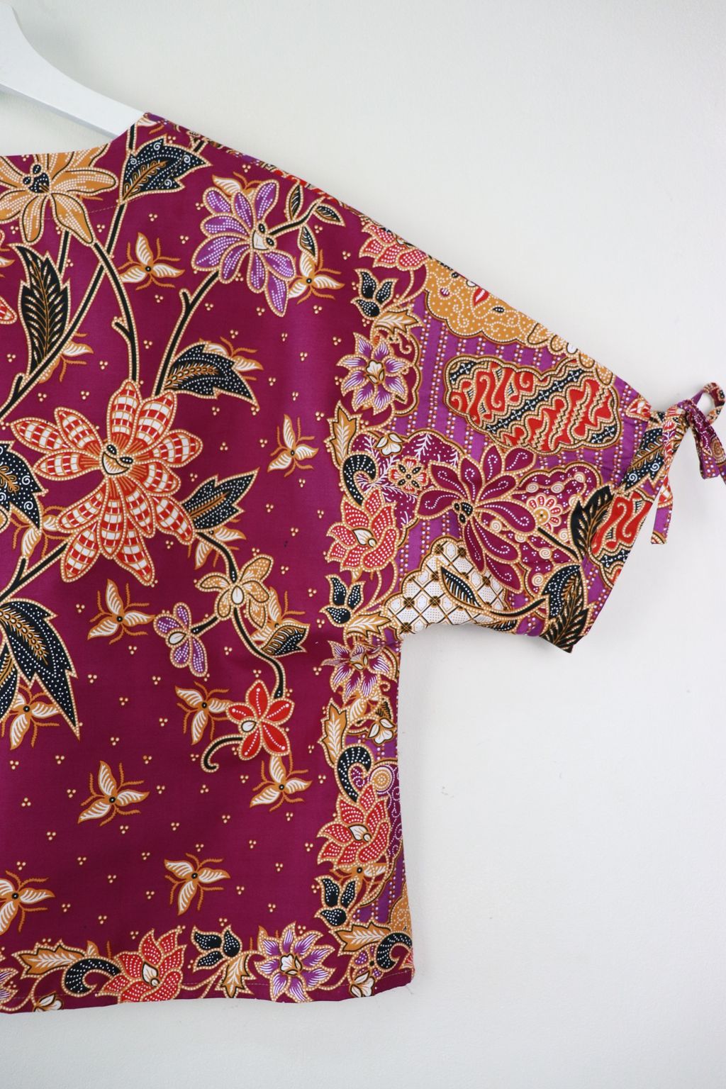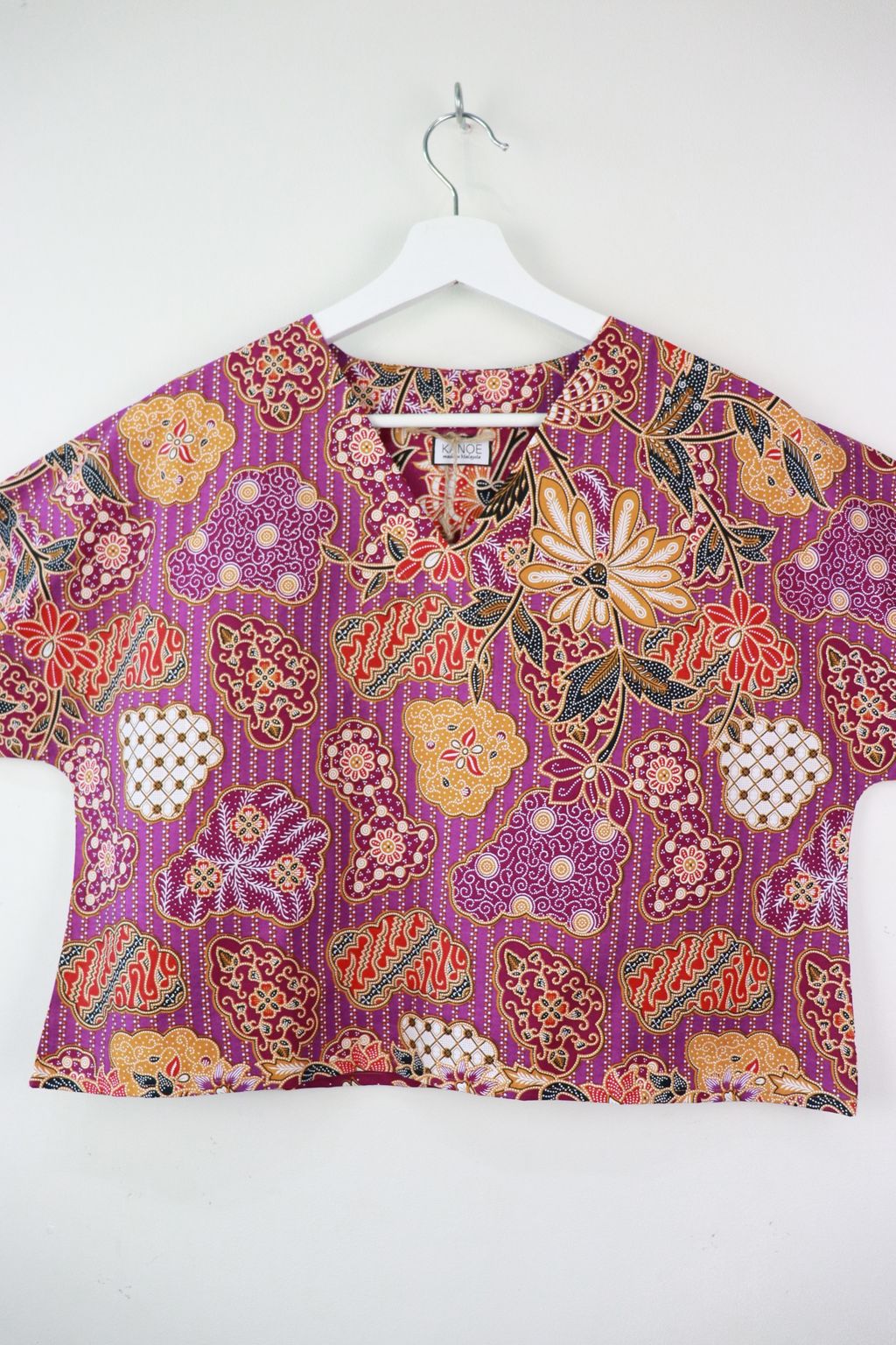 The simple V - neck batik top that suits most figures very well. With sleeves that fall on the shoulders. Wear this with a plain bottom. Both work and play friendly !