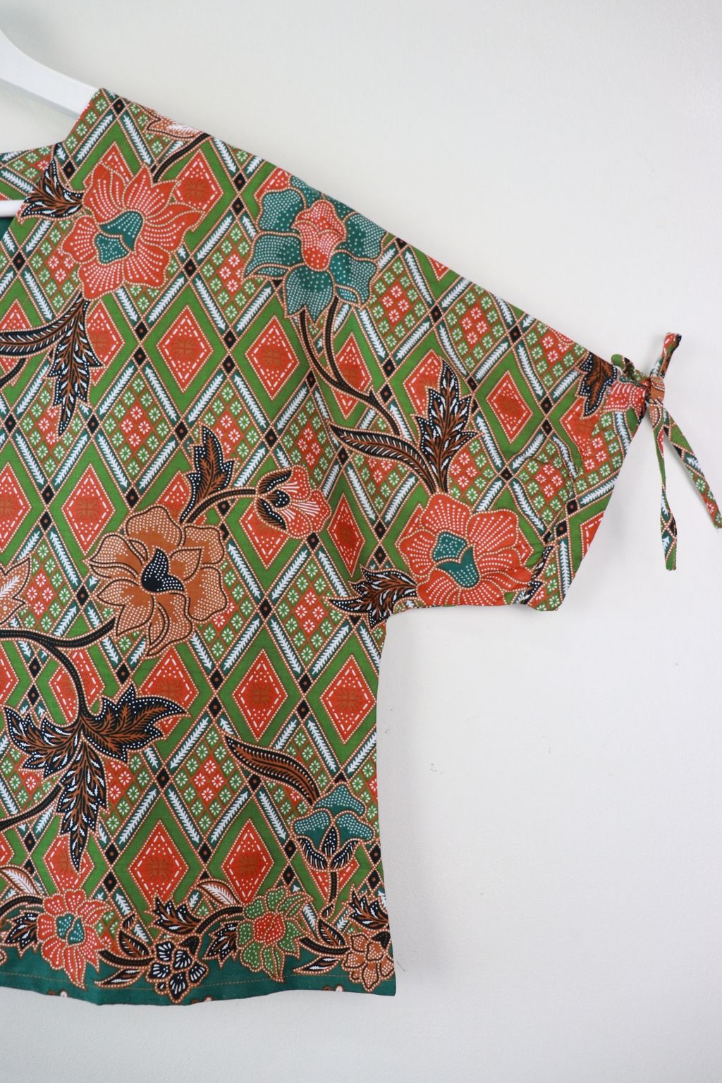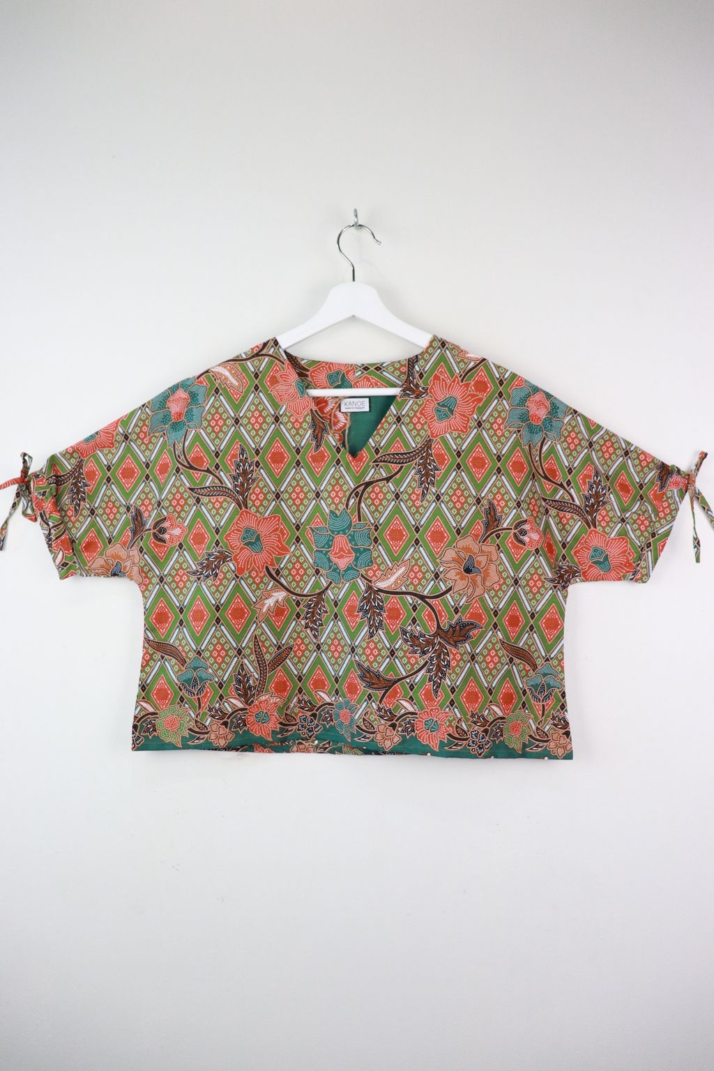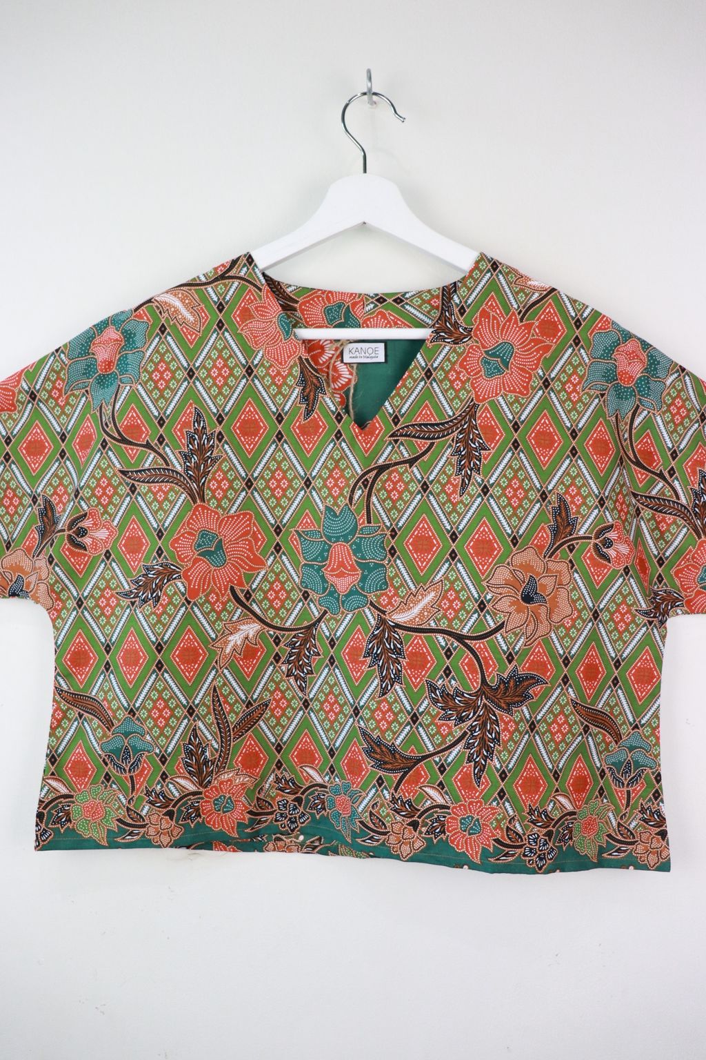 The simple V - neck batik top that suits most figures very well. With sleeves that fall on the shoulders. Wear this with a plain bottom. Both work and play friendly !