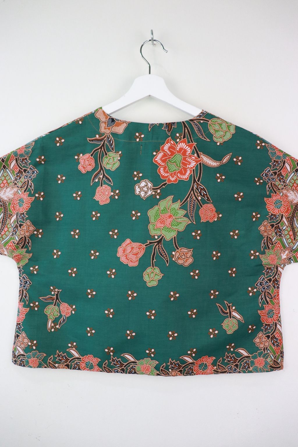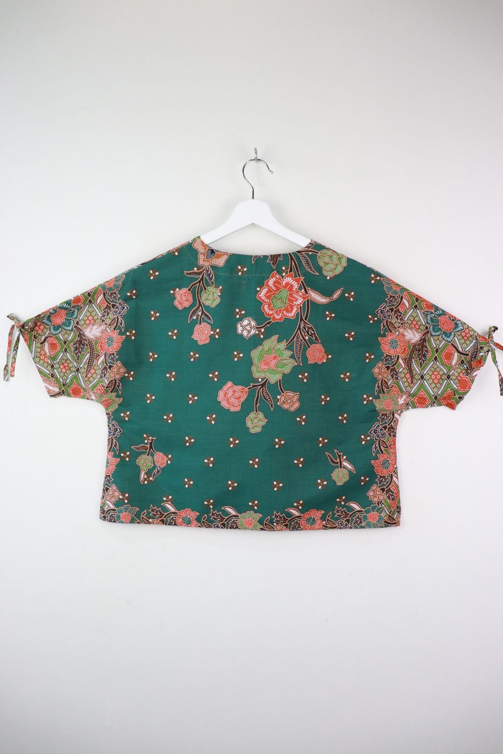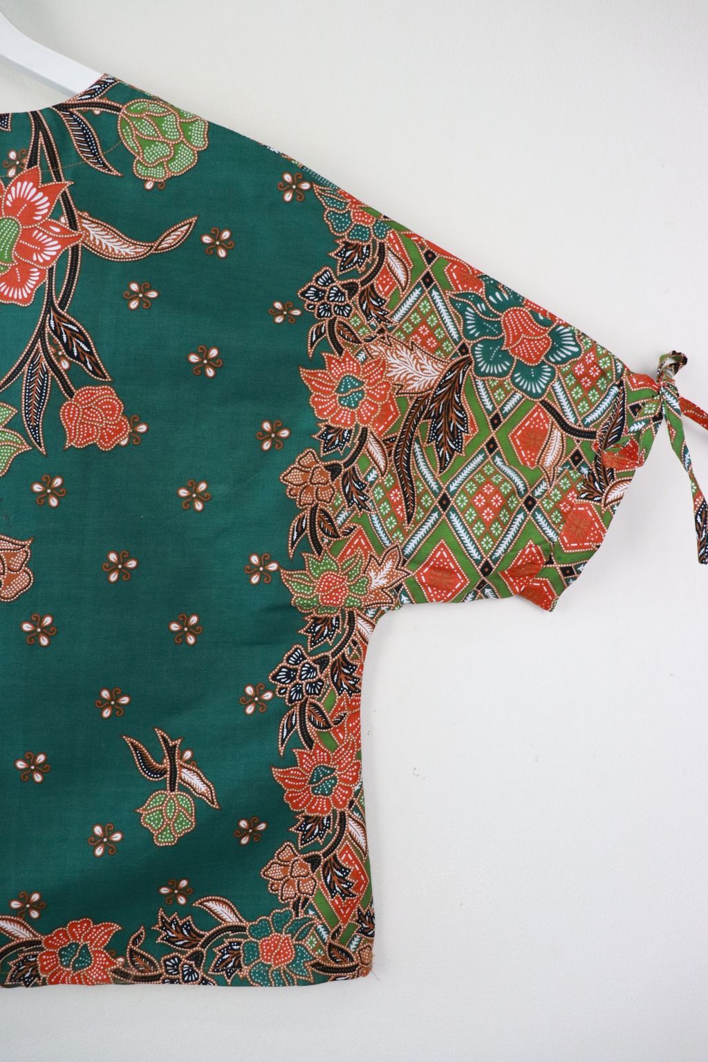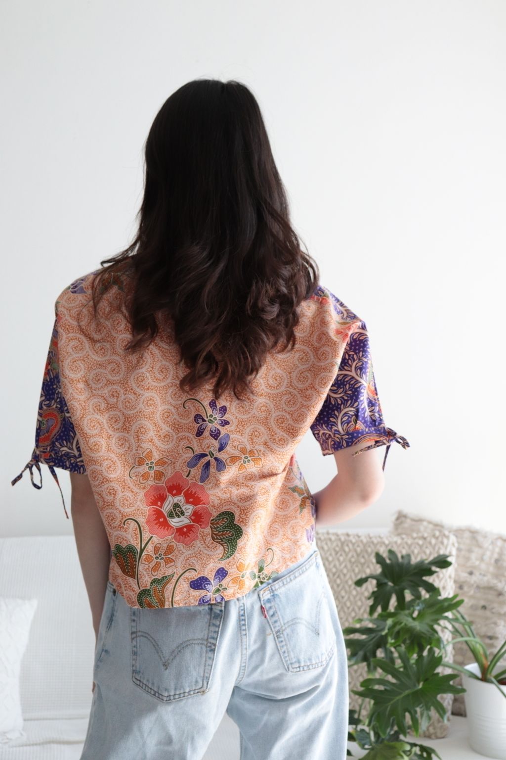 The simple V - neck batik top that suits most figures very well. With sleeves that fall on the shoulders. Wear this with a plain bottom. Both work and play friendly !
