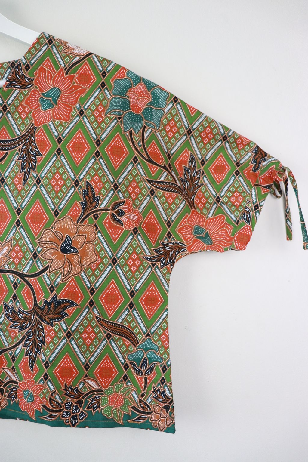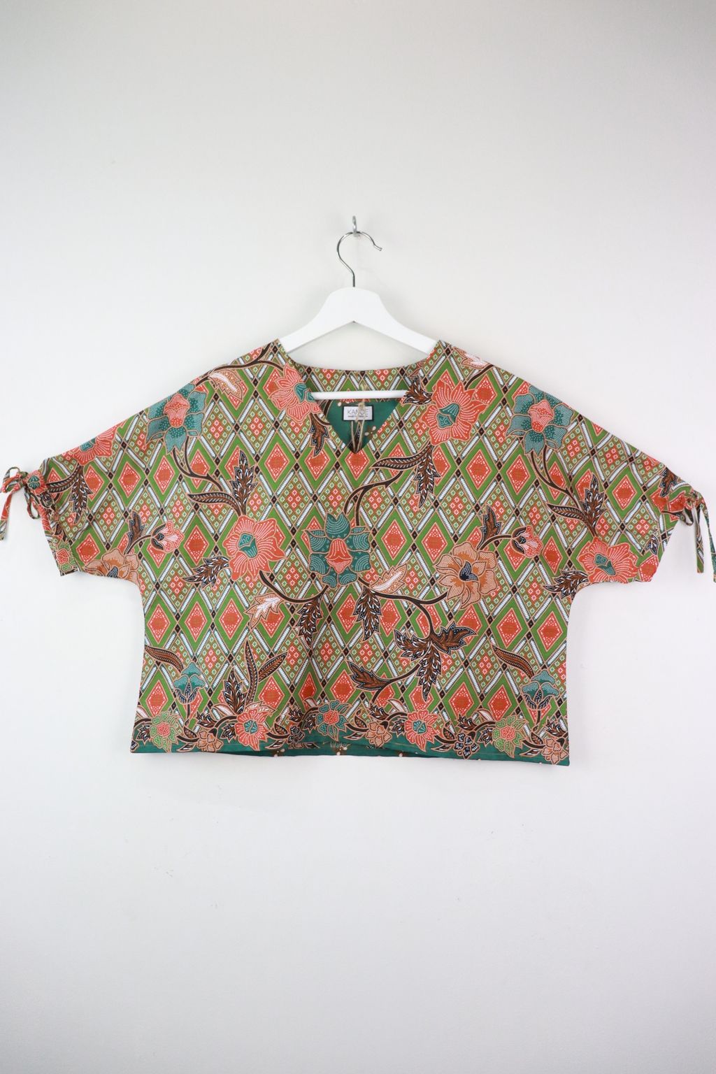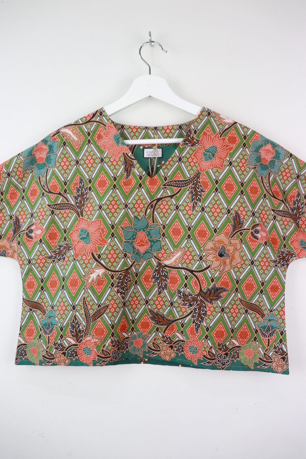 The simple V - neck batik top that suits most figures very well. With sleeves that fall on the shoulders. Wear this with a plain bottom. Both work and play friendly !
