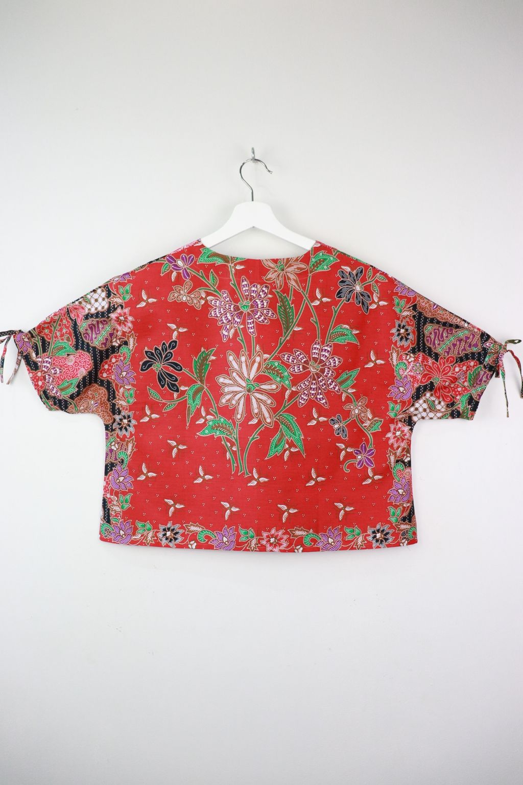 The simple V - neck batik top that suits most figures very well. With sleeves that fall on the shoulders. Wear this with a plain bottom. Both work and play friendly !