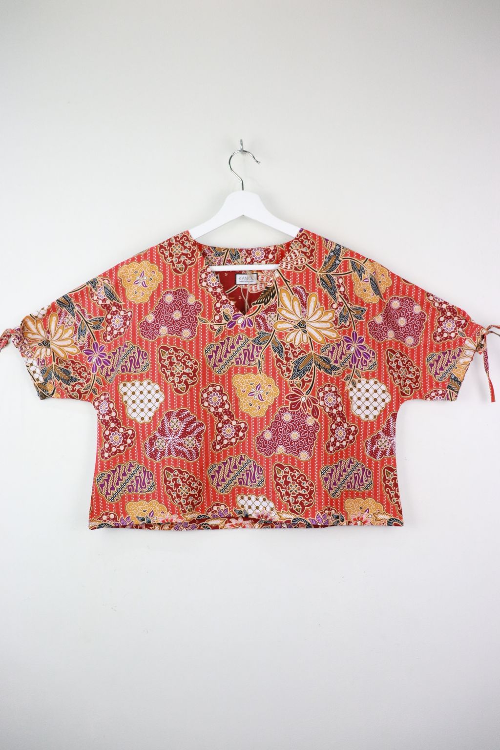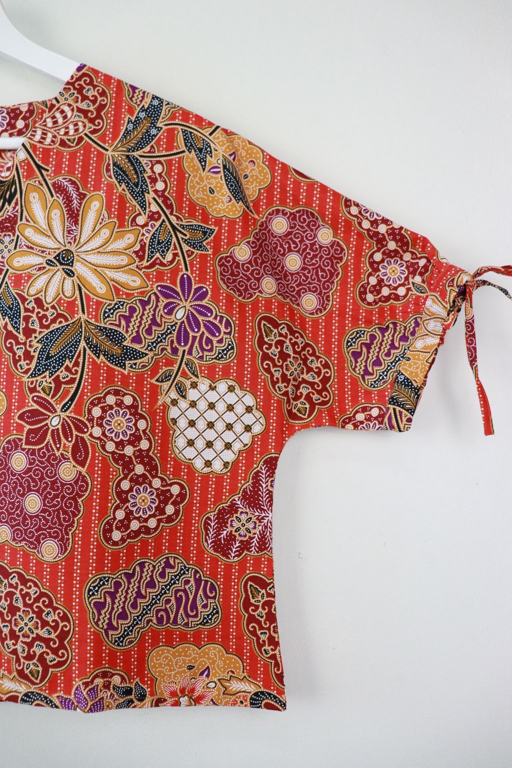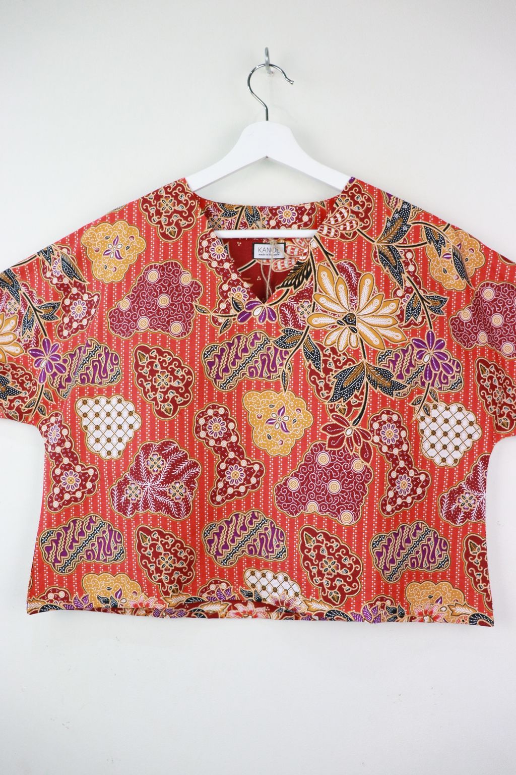The simple V - neck batik top that suits most figures very well. With sleeves that fall on the shoulders. Wear this with a plain bottom. Both work and play friendly !