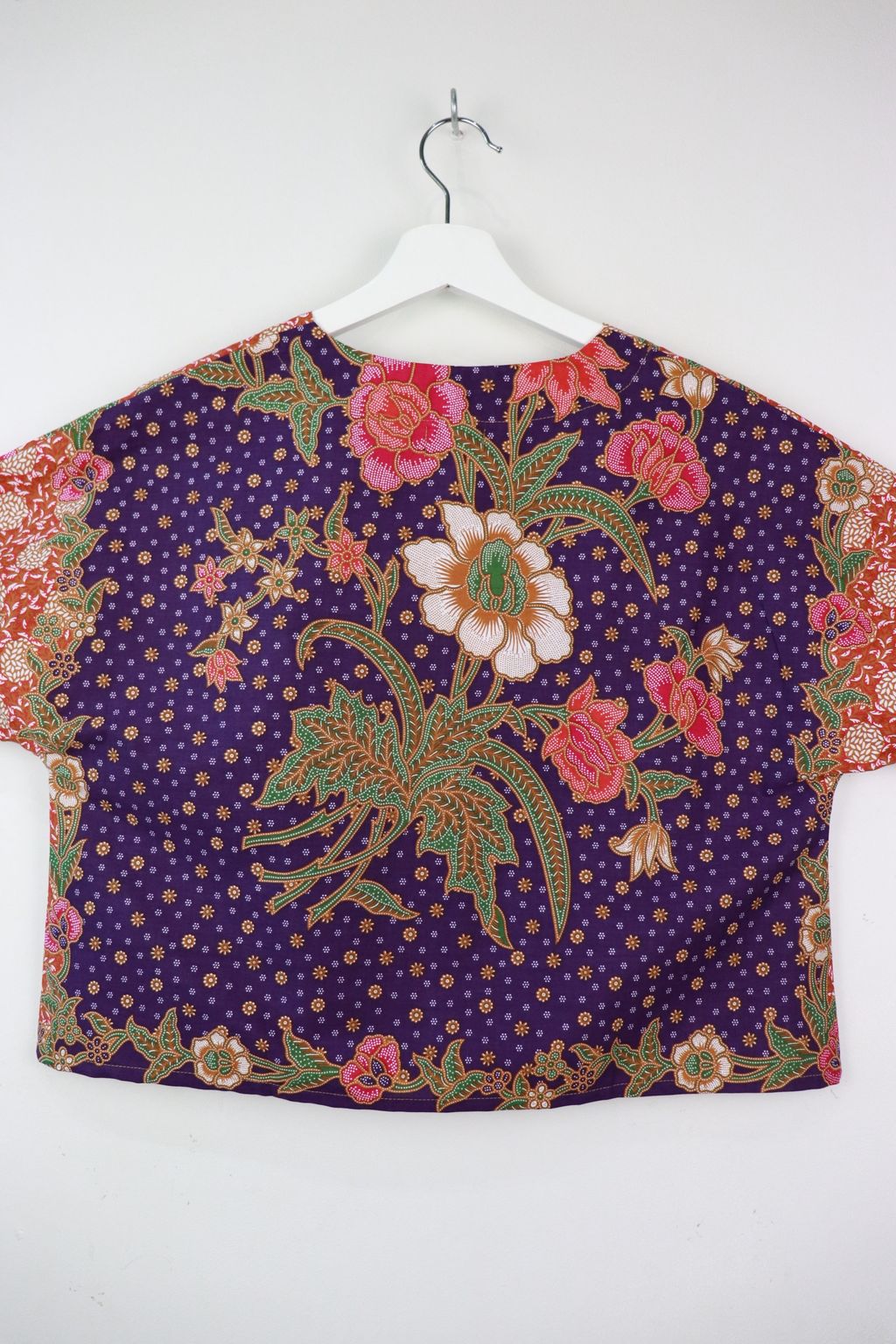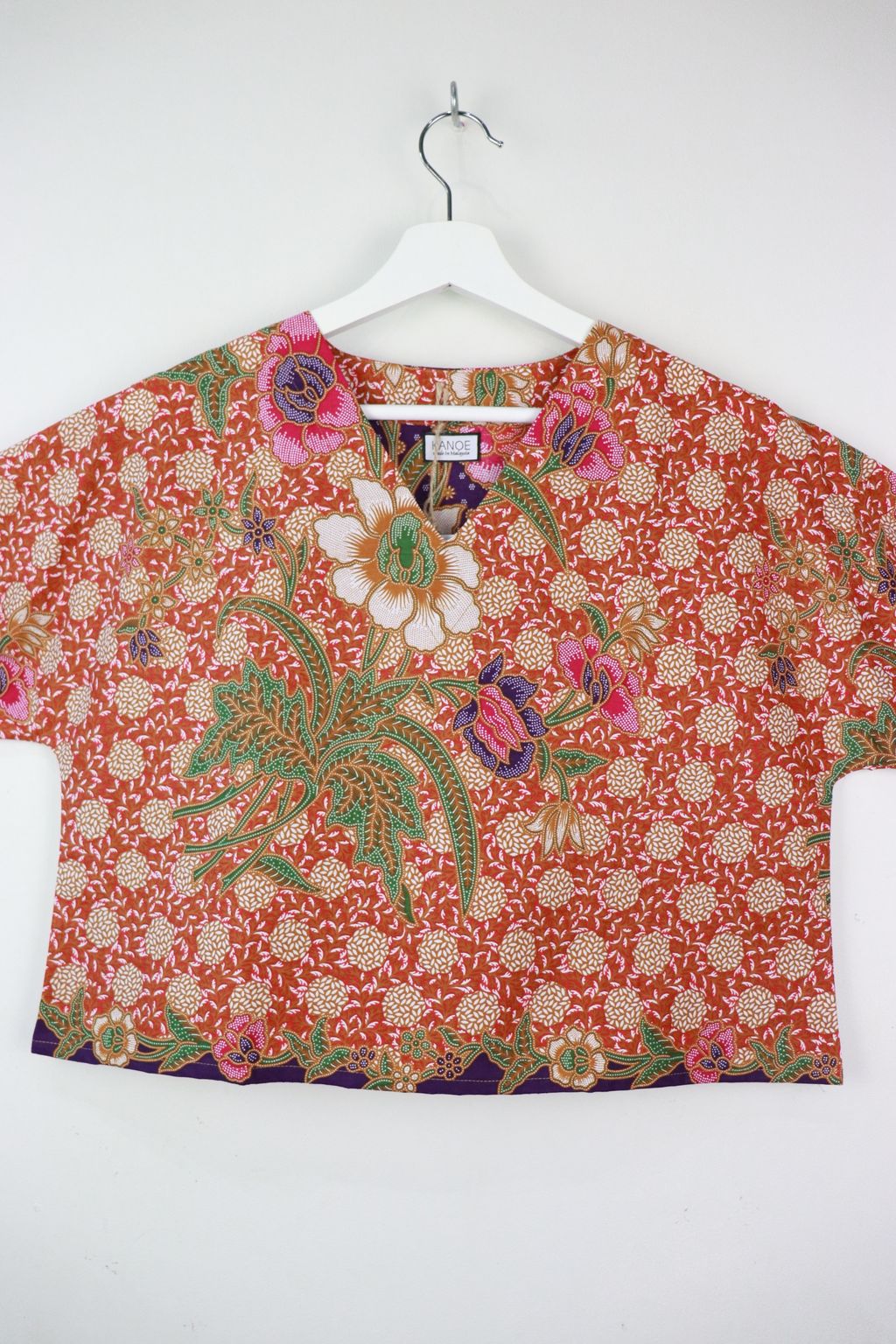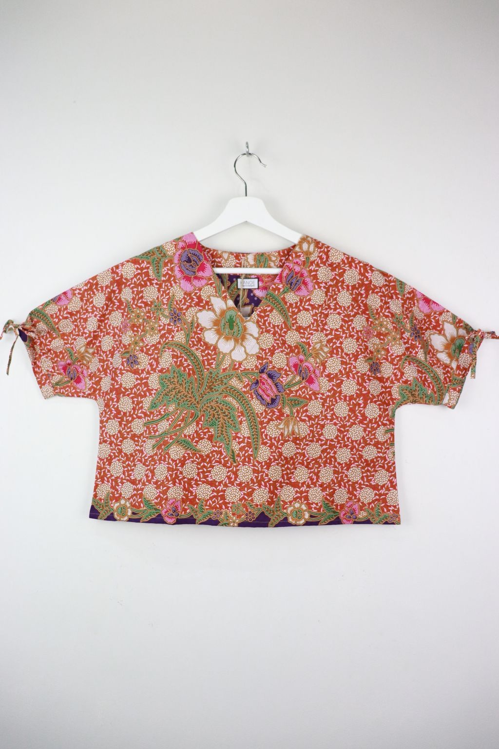The simple V - neck batik top that suits most figures very well. With sleeves that fall on the shoulders. Wear this with a plain bottom. Both work and play friendly !