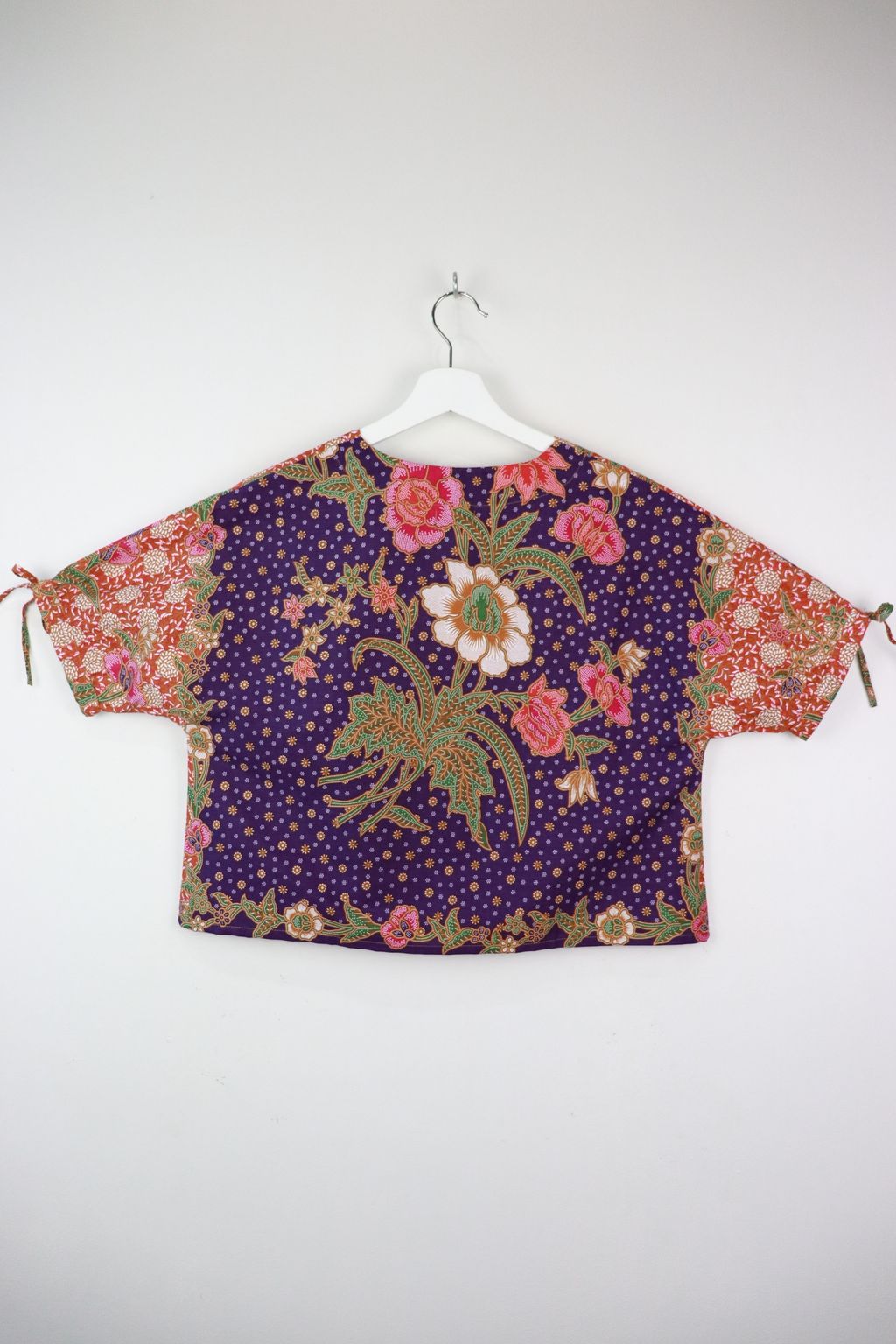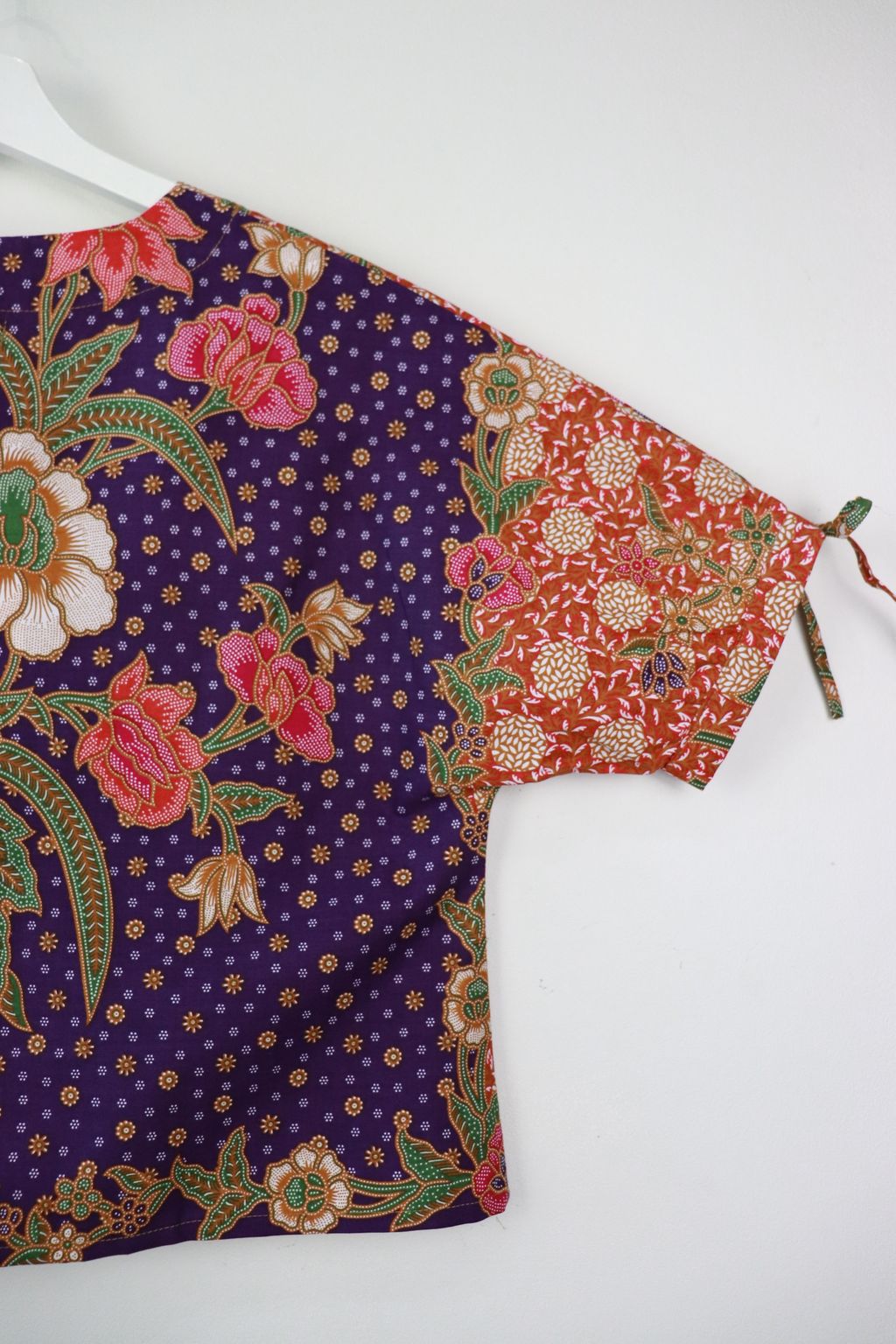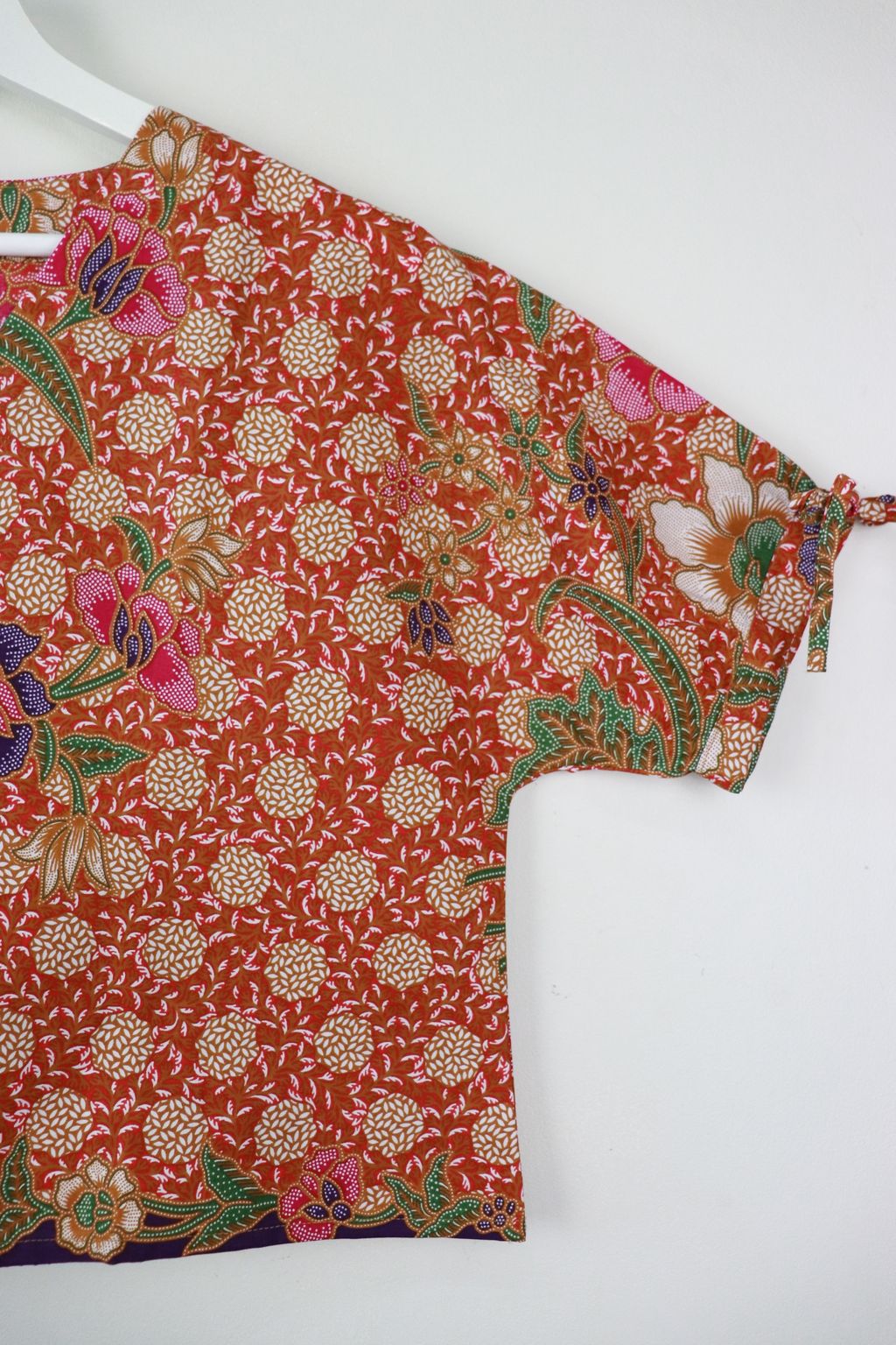 The simple V - neck batik top that suits most figures very well. With sleeves that fall on the shoulders. Wear this with a plain bottom. Both work and play friendly !