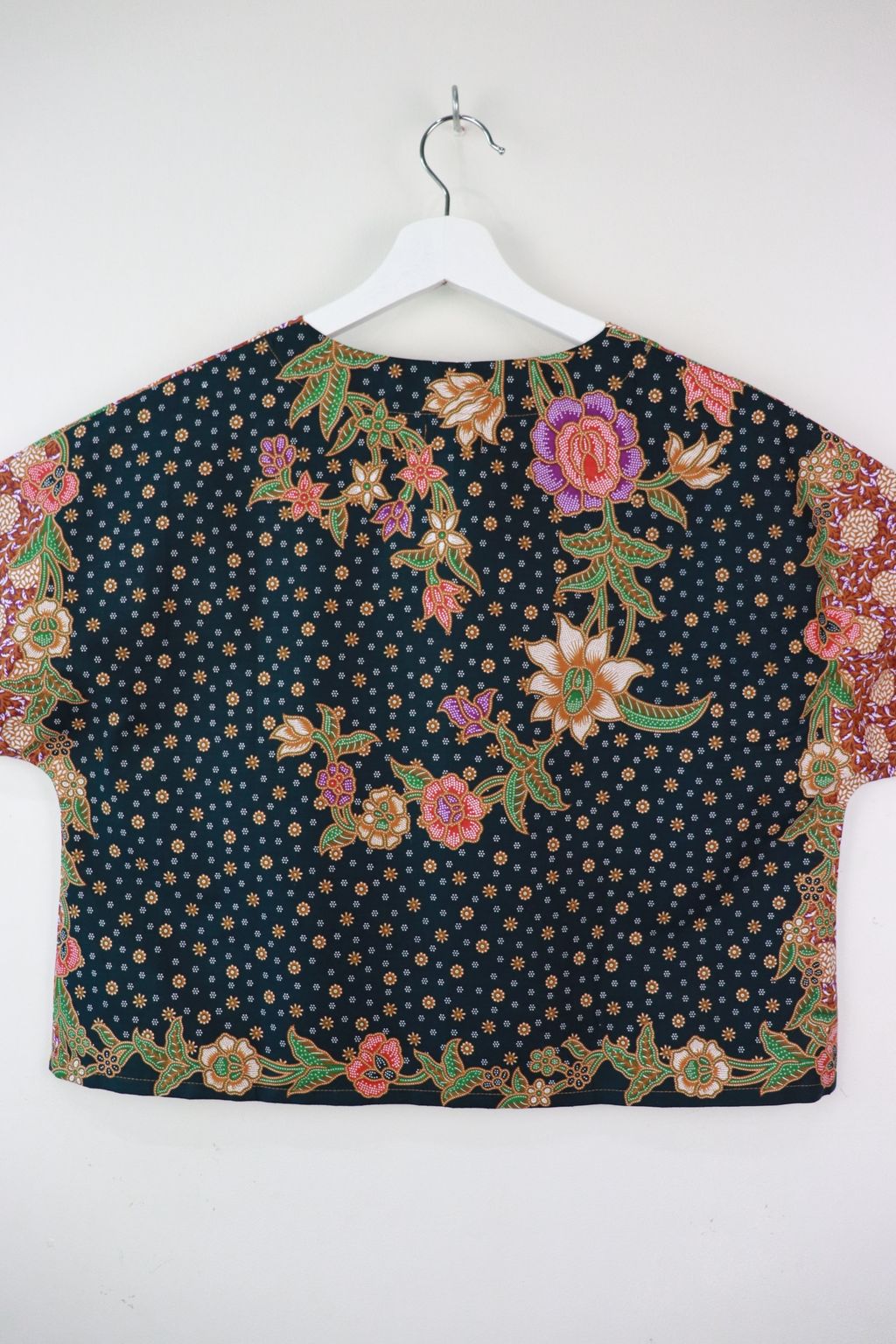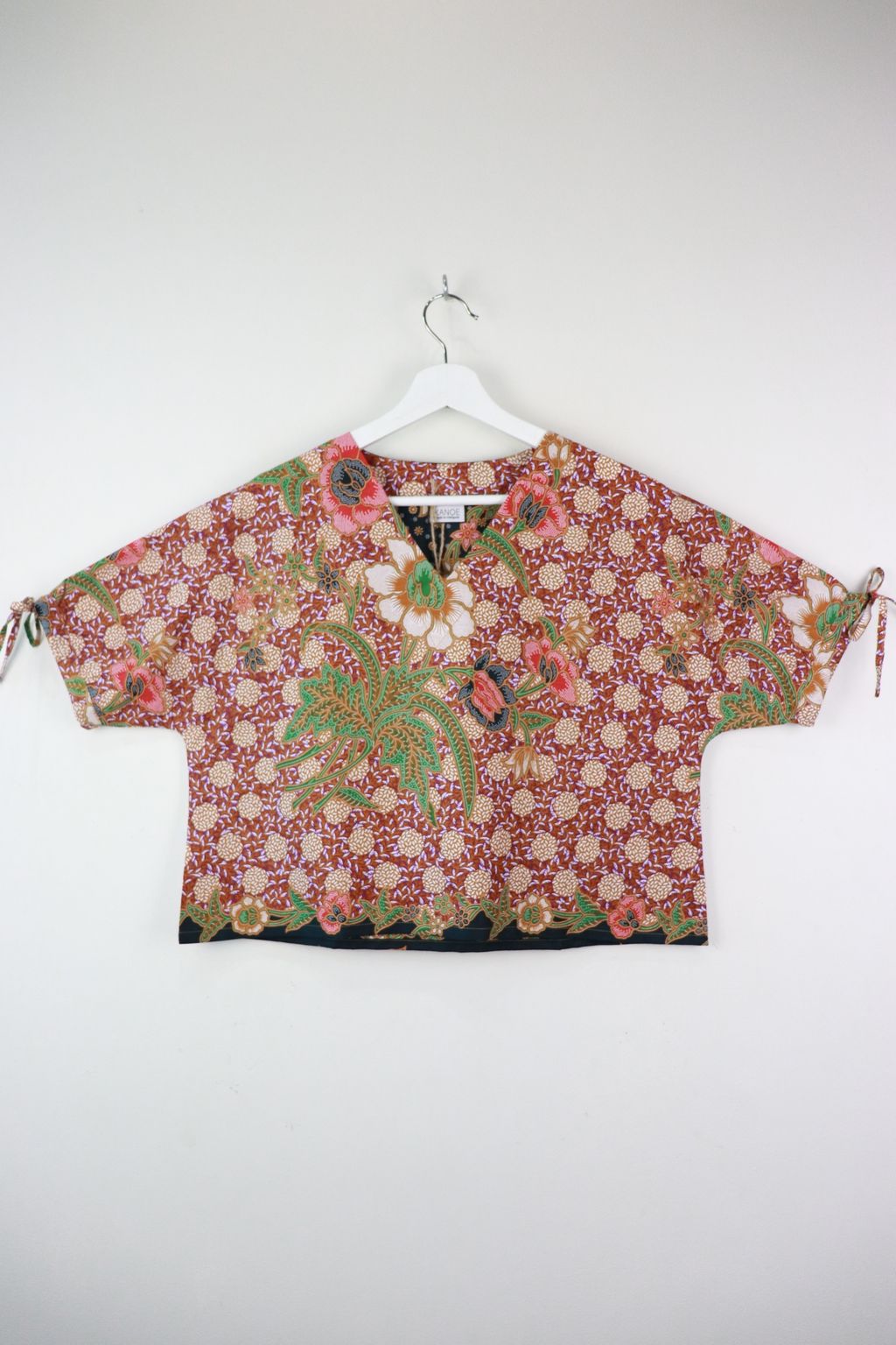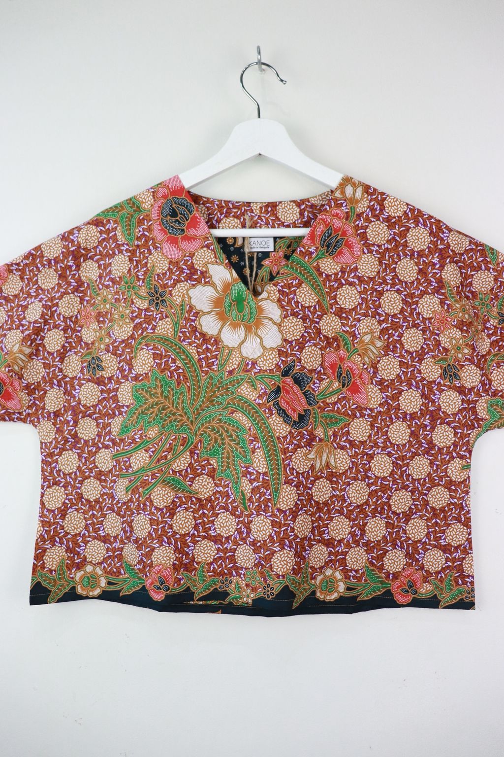The simple V - neck batik top that suits most figures very well. With sleeves that fall on the shoulders. Wear this with a plain bottom. Both work and play friendly !