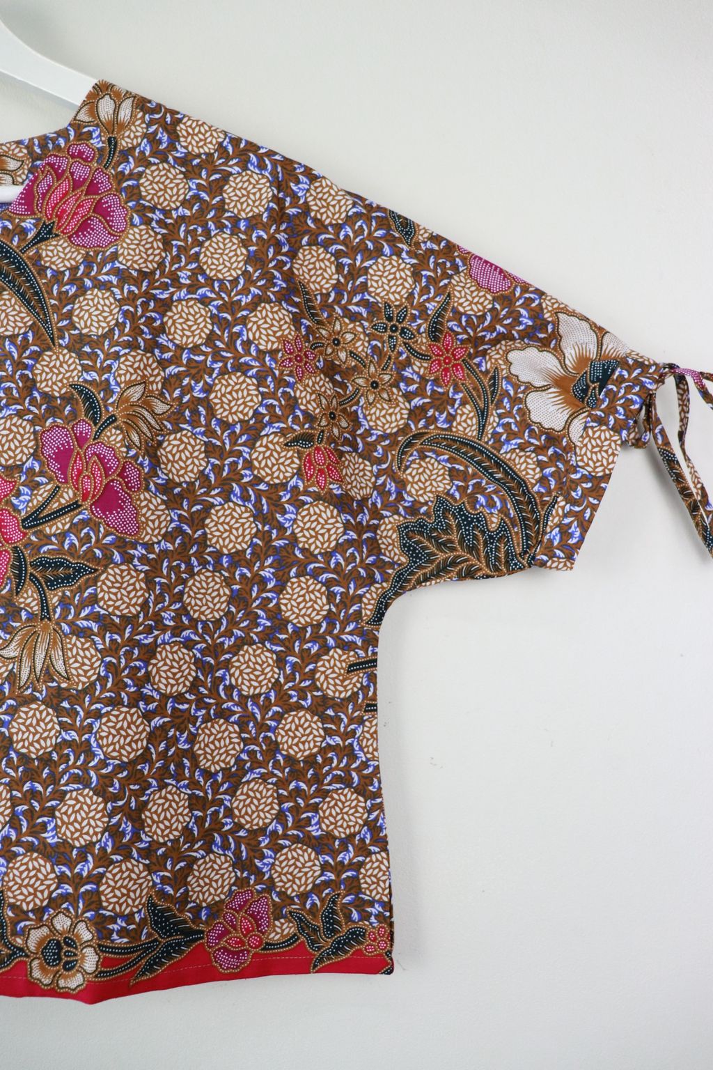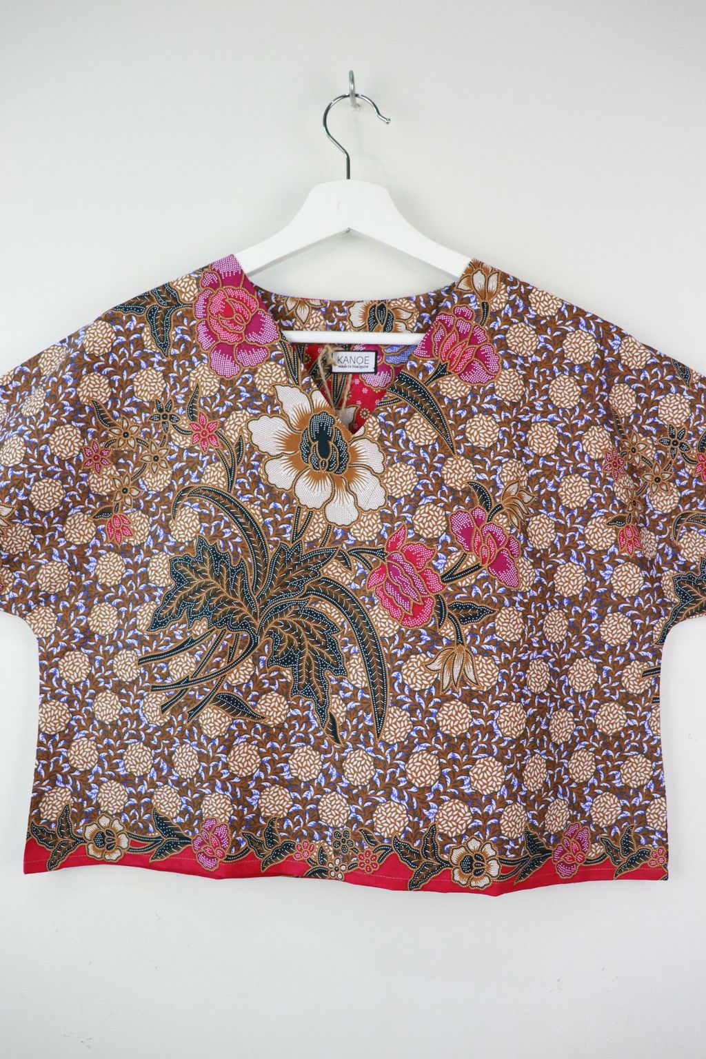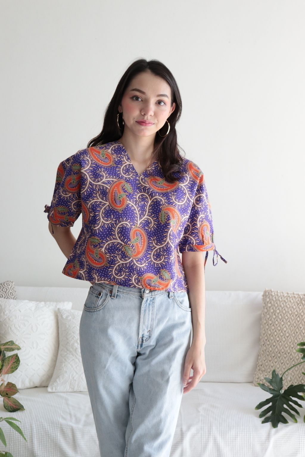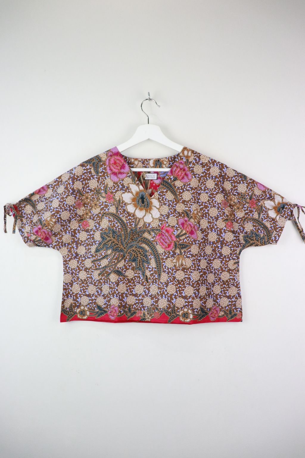 The simple V - neck batik top that suits most figures very well. With sleeves that fall on the shoulders. Wear this with a plain bottom. Both work and play friendly !