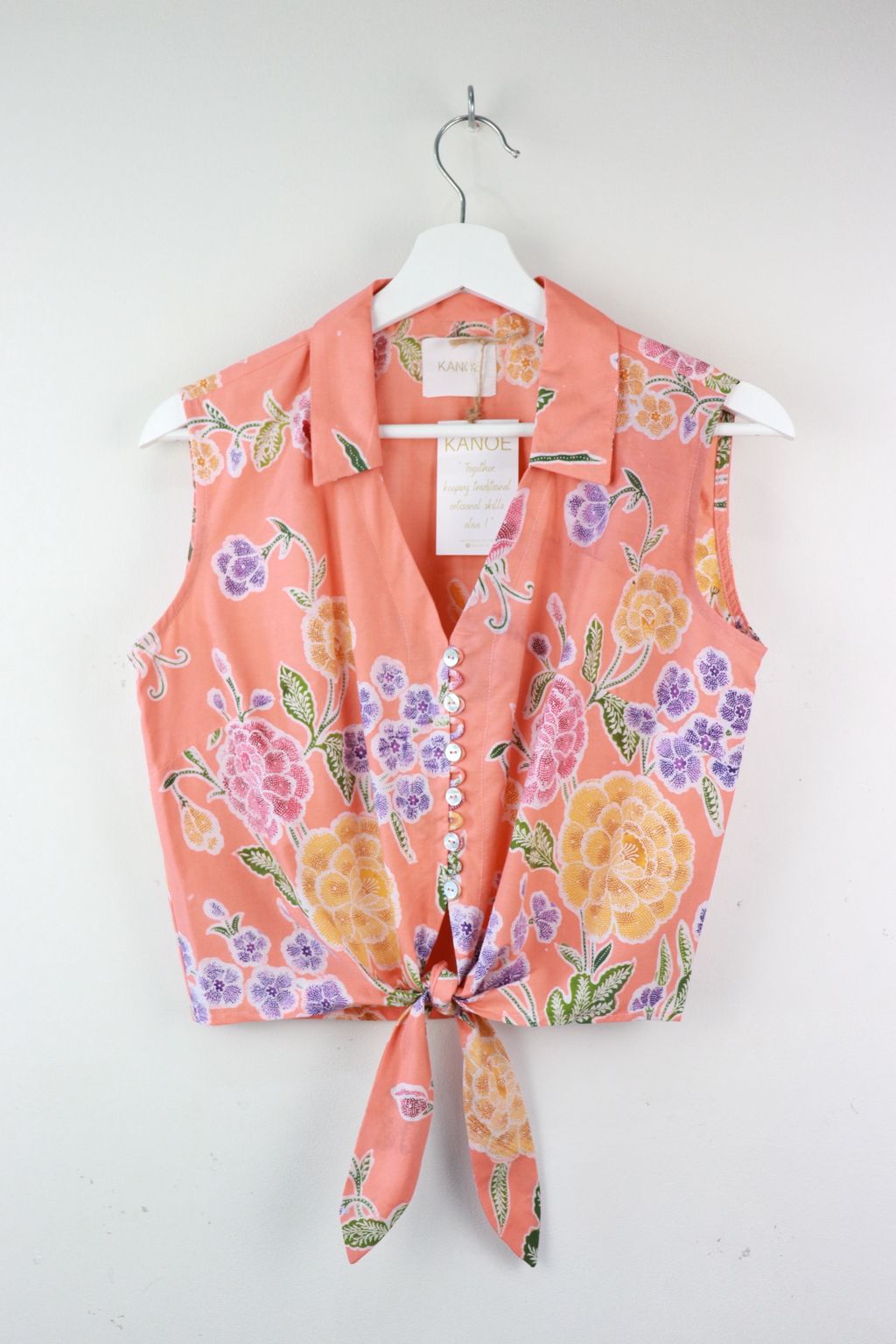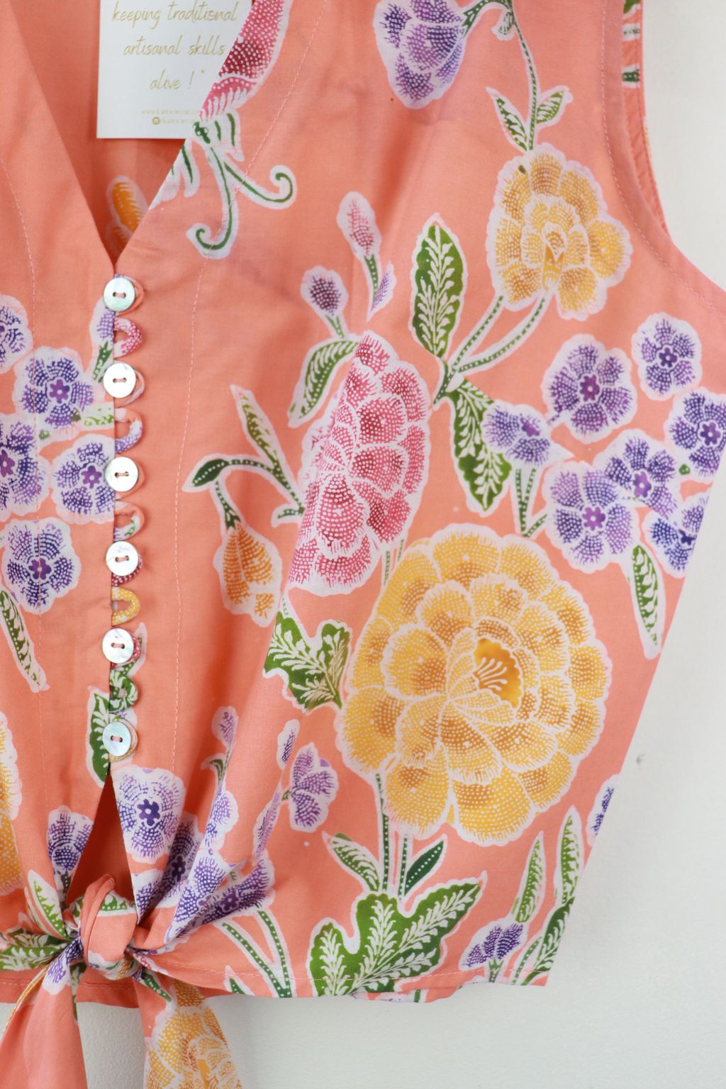 These pastel sleeveless front tie top are made from intricate hand stamped batik textile. Not one piece alike, you will love how beautiful the colours and print of this batik is made by skilled artisans of centuries of batik making wisdom. These batik come from a region where the batik makers have influence from Chinese and European merchants in which is on display in the motifs and colours of the batik.