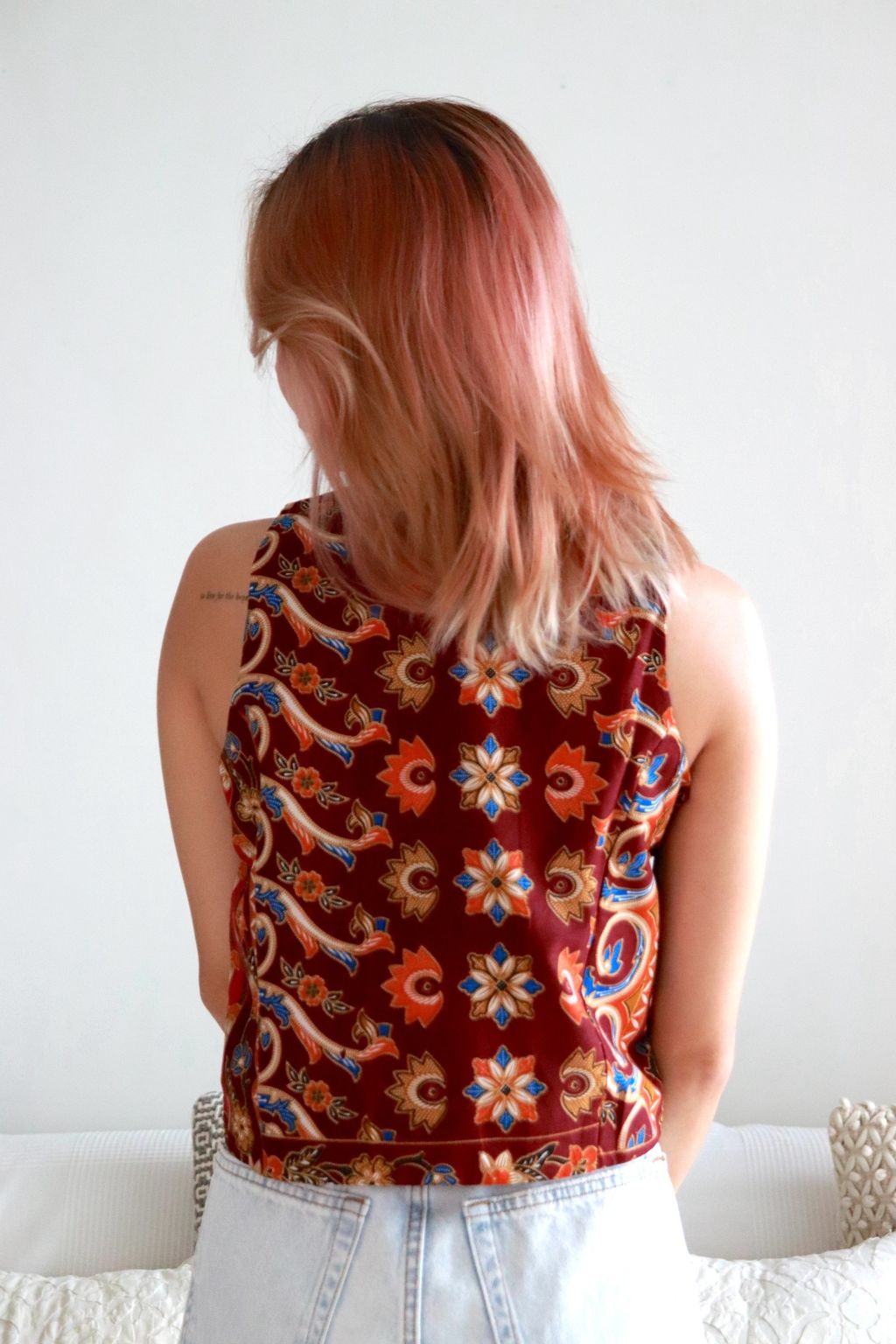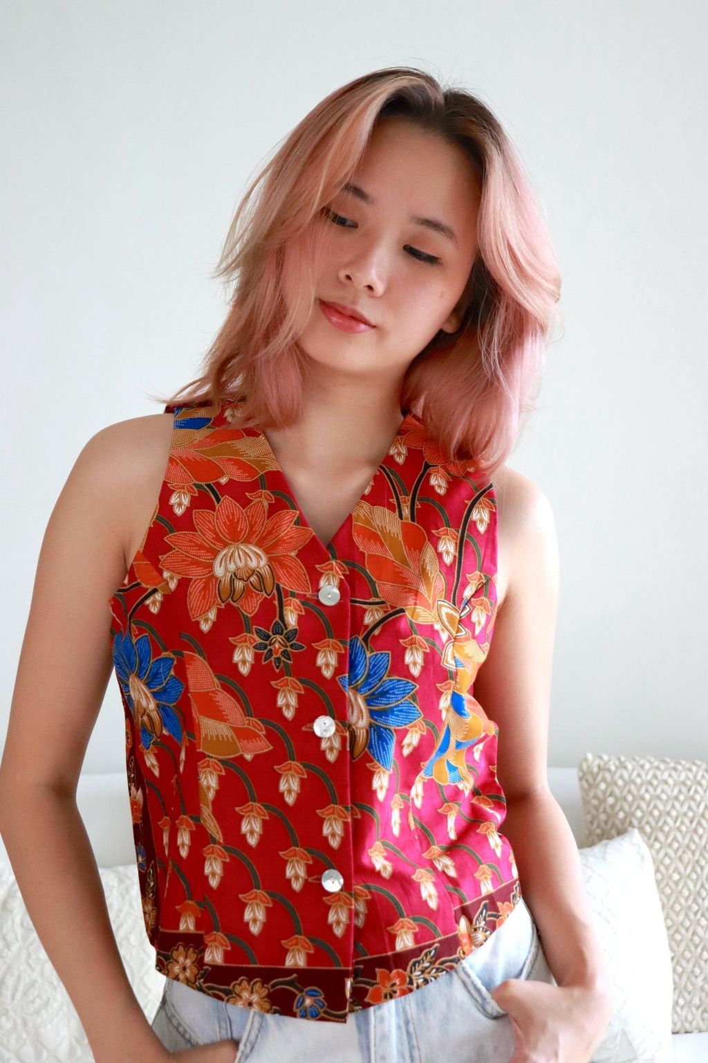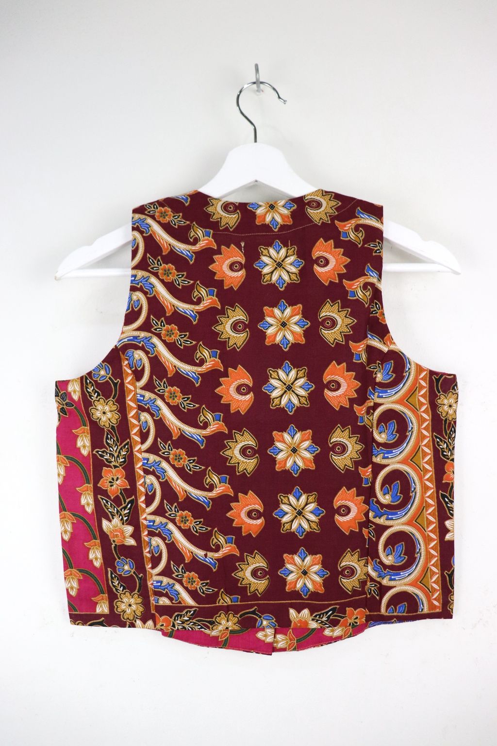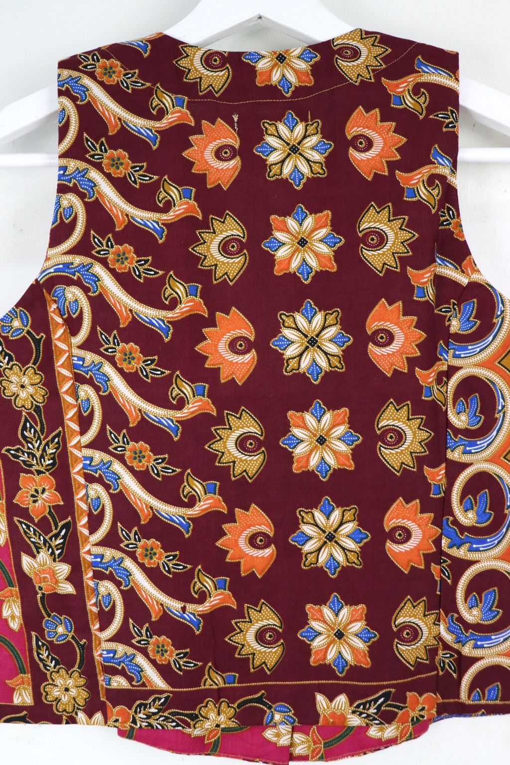 Having batik in the classic vest cut with mother of pearl buttons running through the centre front, this definitely is a statement piece of batik fun with that bit of tailored structure holding it up to becoming an ultimate dream piece.