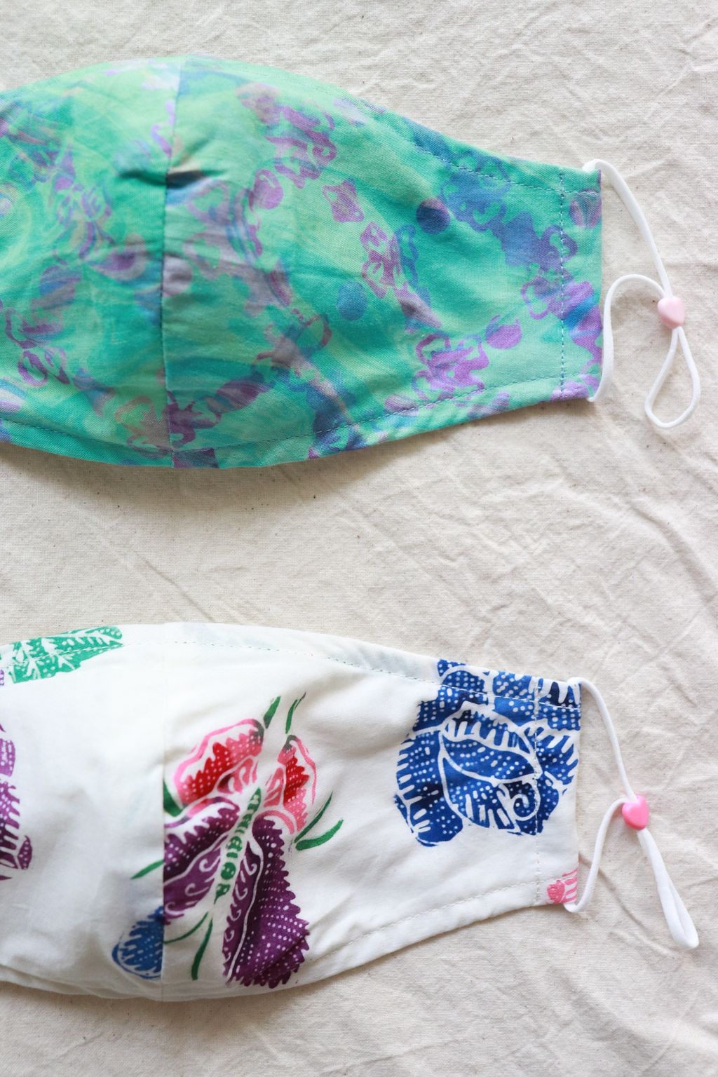 Made of 1 front layer of Handstamped Batik textile 100% Cotton and 2 back layers of Poly cotton fabric, making it 3ply.
