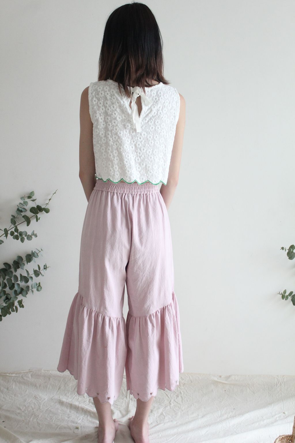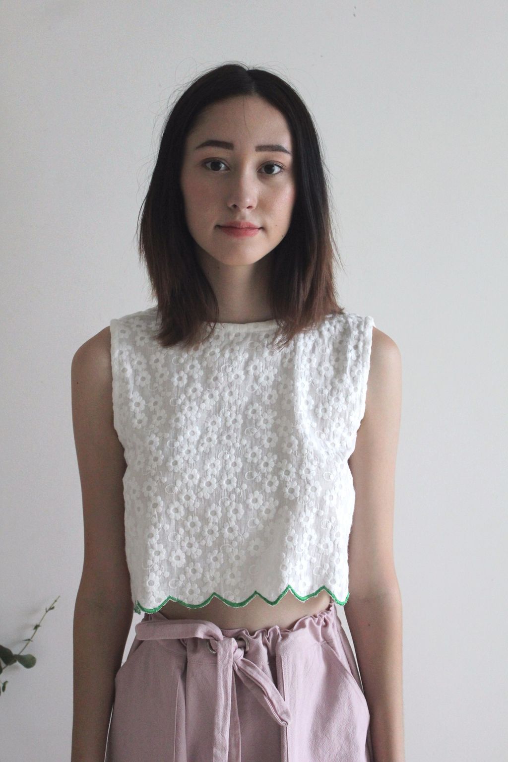 This lil cropped top with a gross grain ribbon tie at the back is so lovely and cute. 100% cotton fully embroidered floral motifs, finished with an italian green scallop sulam edge for a pop of color!
