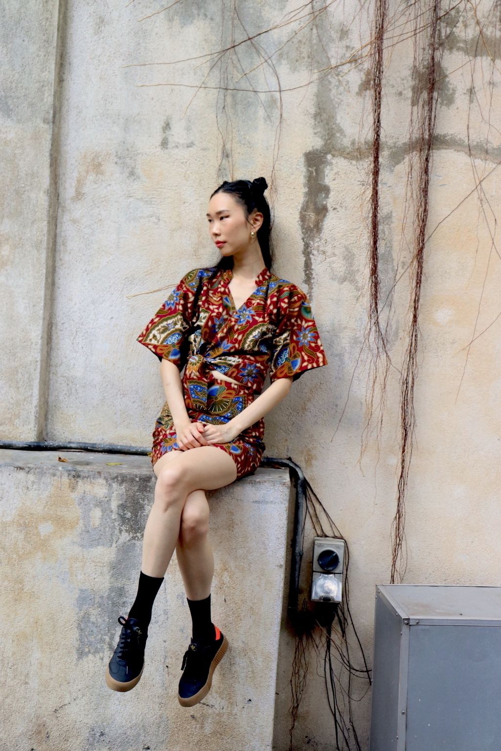 100% cotton of a kimono wrap top + a fitted mini skirt with side zip and elastic waist at back.