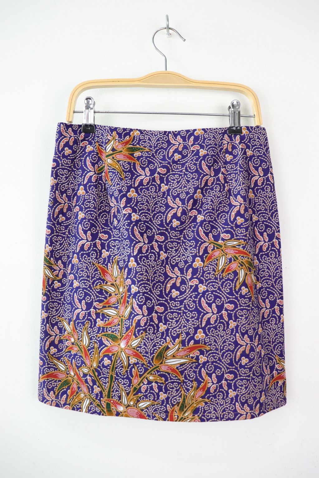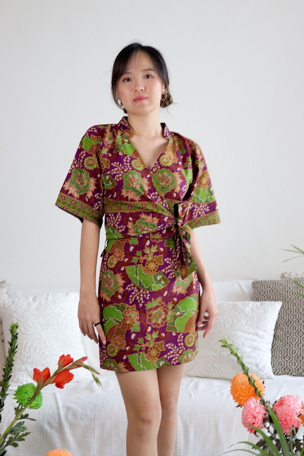 100% cotton of a kimono wrap top + a fitted mini skirt with side zip and elastic waist at back.