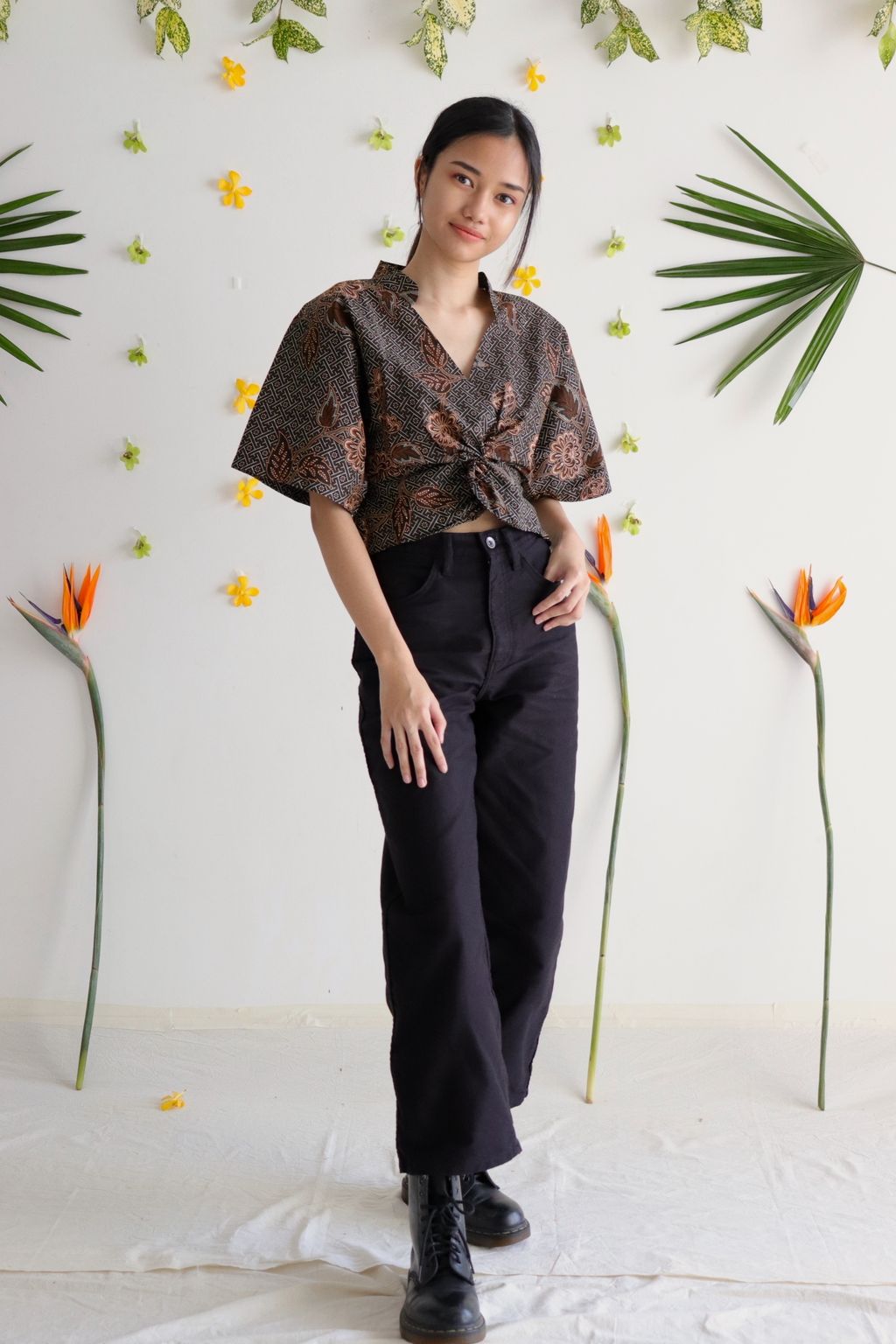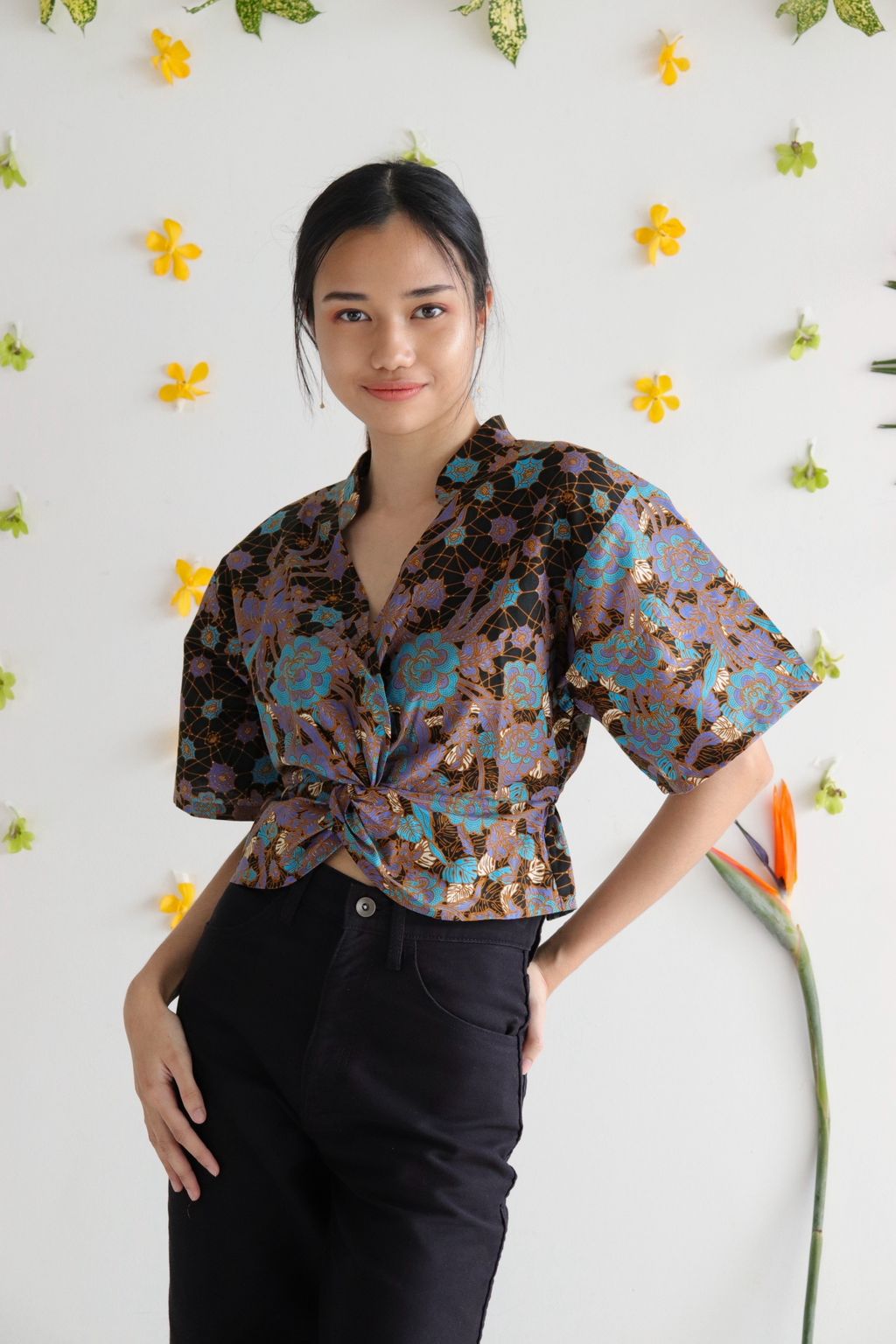 Featuring a mandarin collar and a twisted front, perfect for casual or formal wear.